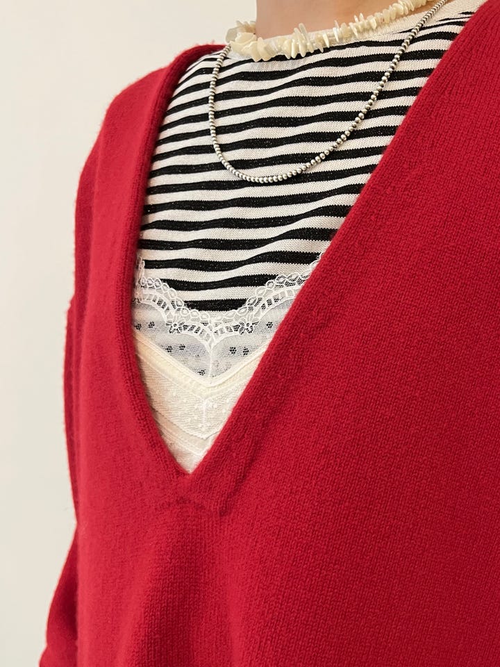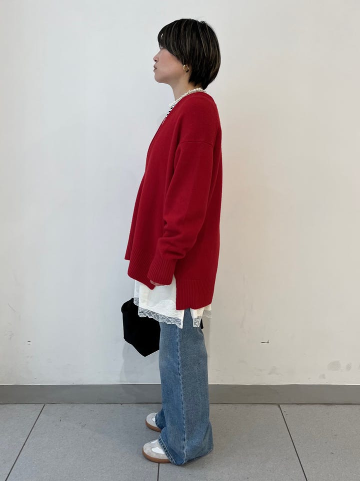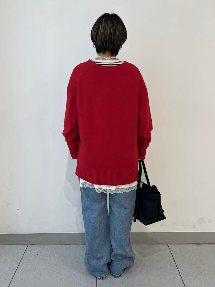着心地:カシミヤ混のとても暖かいニット。深めのVネックなのでカットソーからシャツ、ブラウスまでレイヤードを楽しめます。