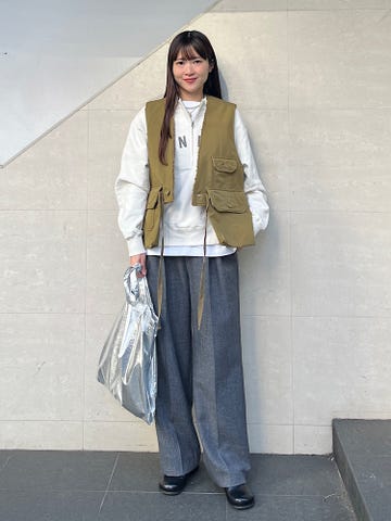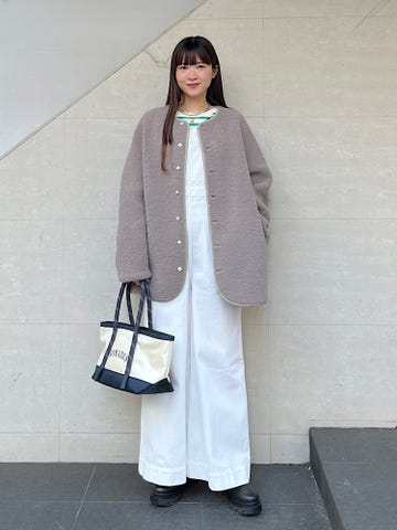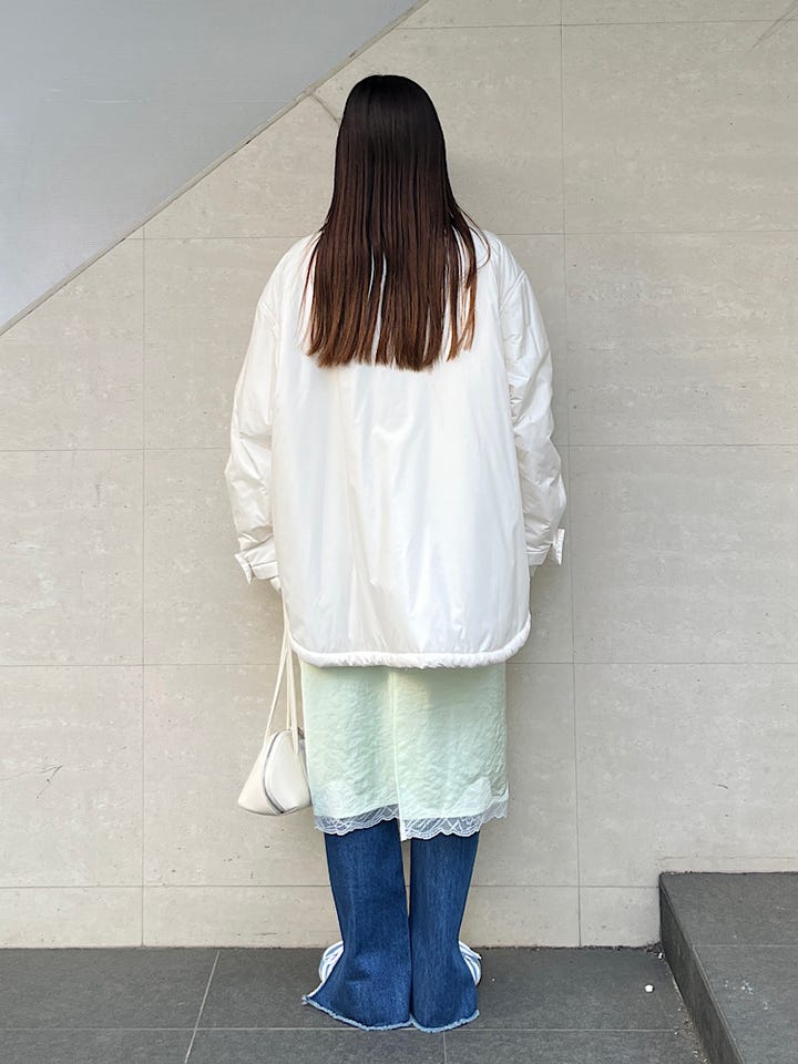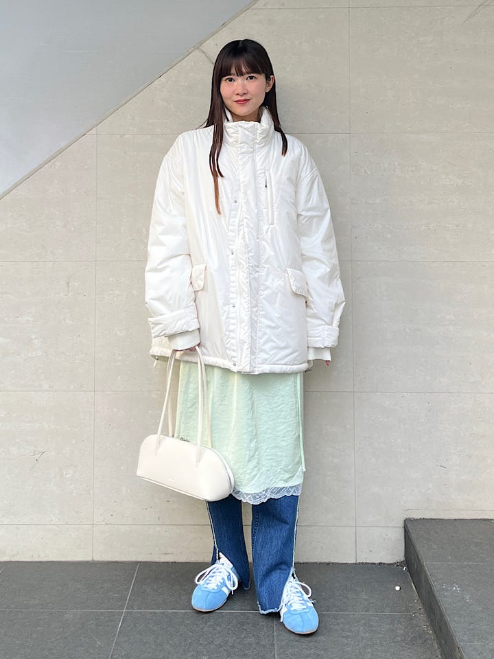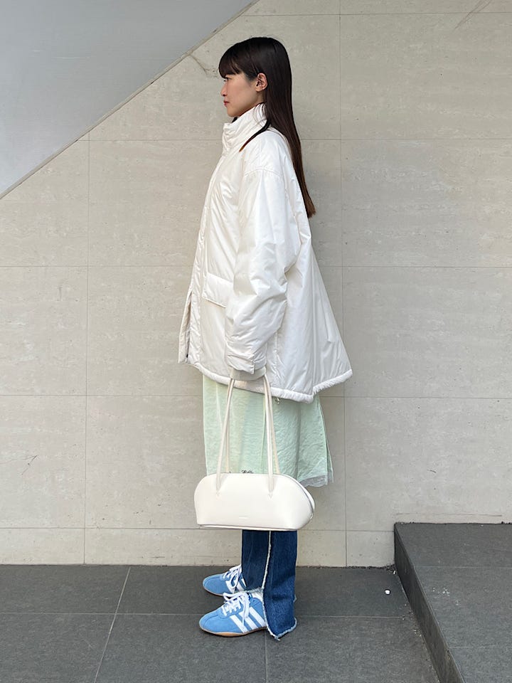 とても軽いのが特徴で、中綿で温かいです。ゆったりしてる分中にも着込みやすいです。オーバーサイズのシルエットがおしゃれな印象になります!