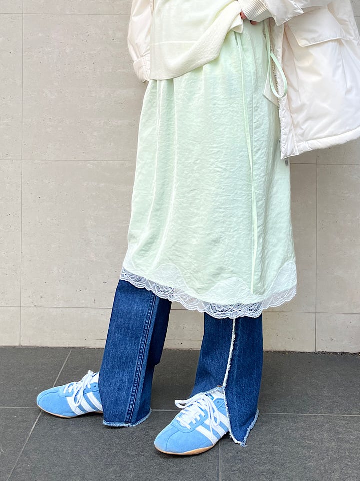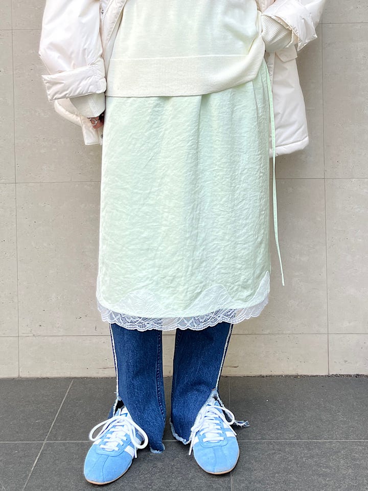 サテンとレースの組み合わせが春らしい印象で季節の先取りにおすすめのアイテムです。お手持ちのパンツに重ねるだけで新鮮な印象になります。