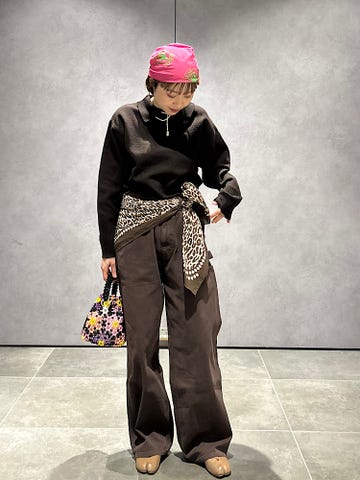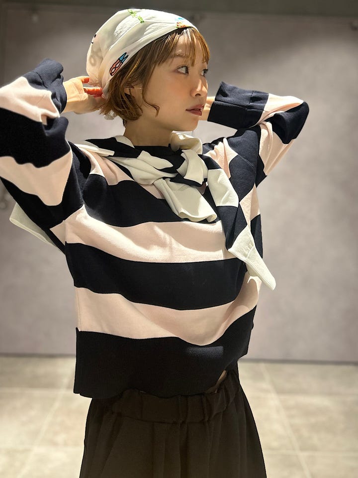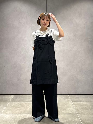 素材感・着心地:やわらかく薄すぎない生地感が肩回りも馴染みやすく、ゆとりあるフィット感ですがラフに見えすぎません。コンパクトな丈感でハイウエストボトムスと特に相性が良いです。肩掛けしているのも同商品・色違いです。