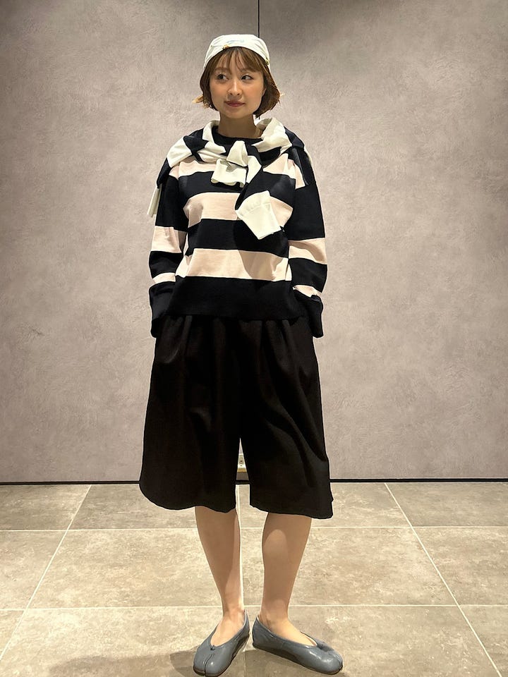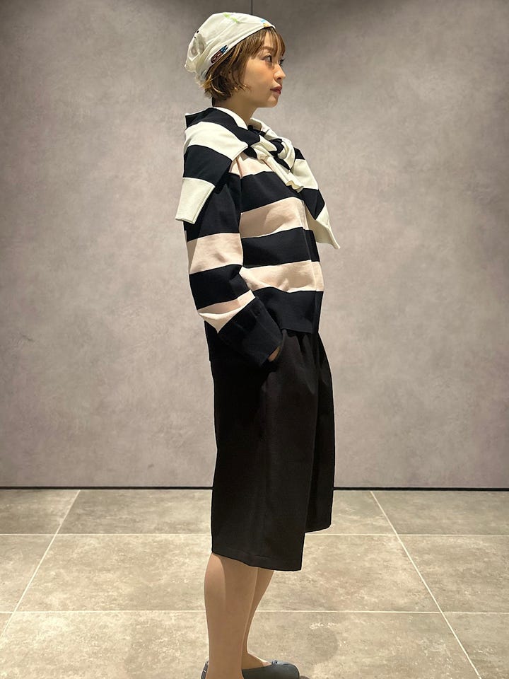 素材感・着心地:ウエストはドロスト入りでトップスに合わせて調整しやすいです。少し長め丈なのでハーフパンツに挑戦したい方へも取り入れやすいです!今の時期はロングブーツとのスタイリングもおすすめです。