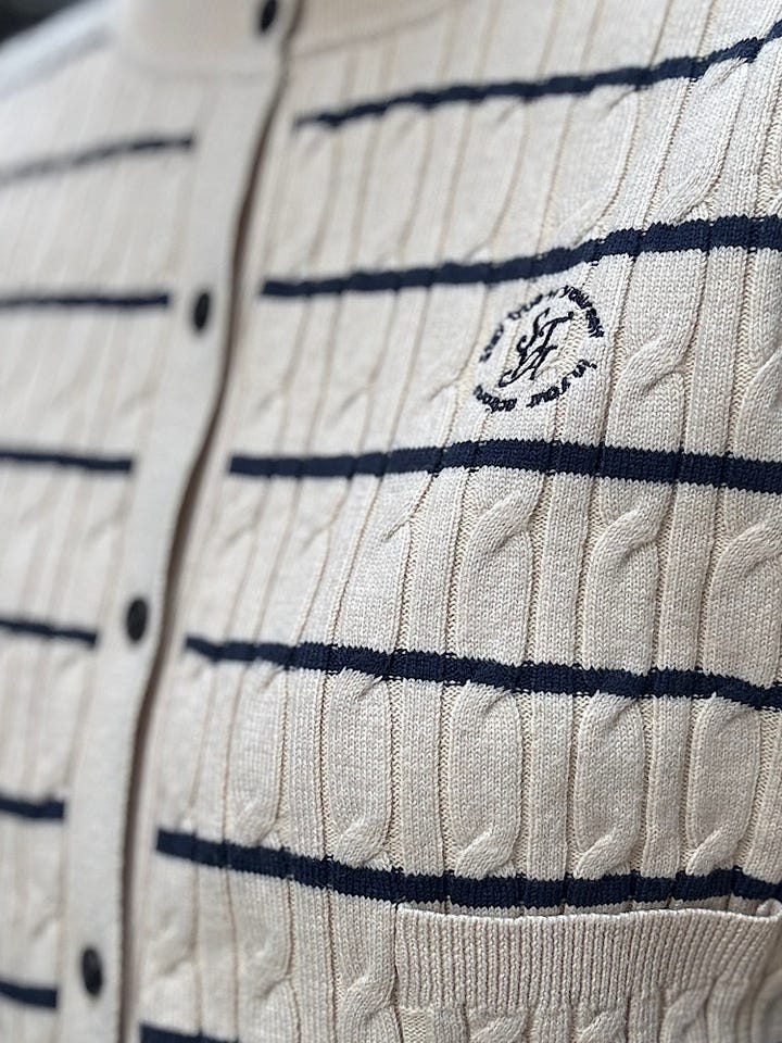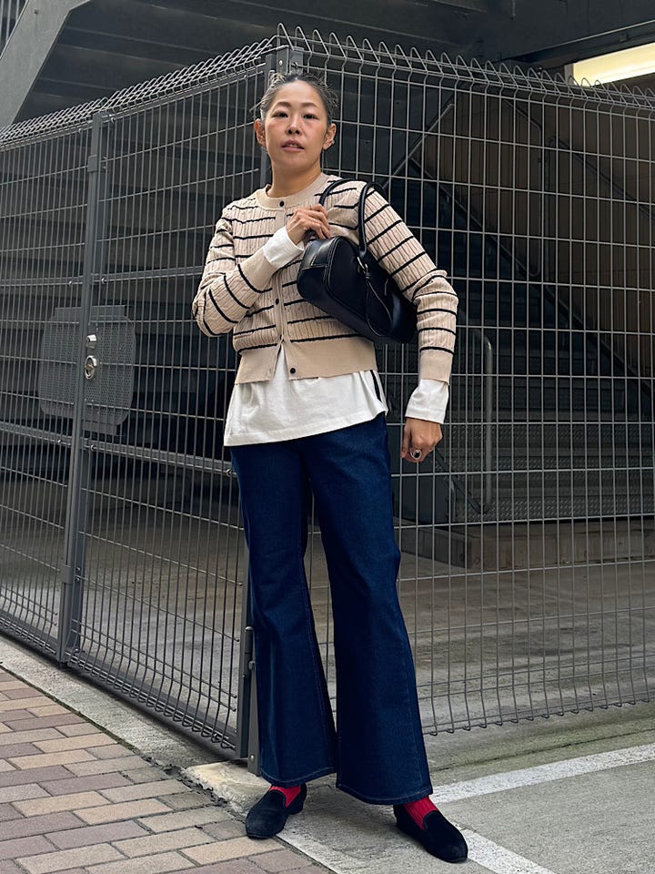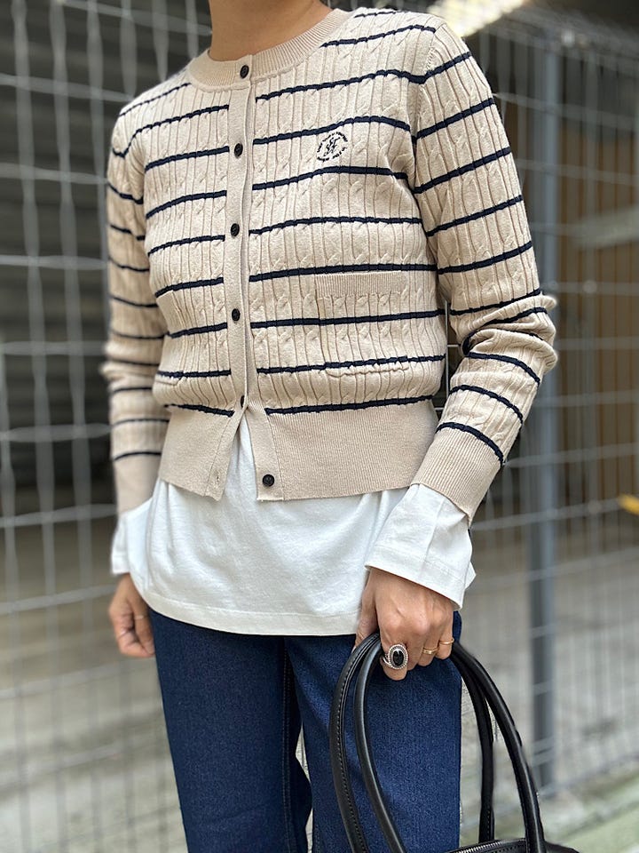 【素材感・着心地】ミニケーブル編みのボーダーニットカーディガン。コンパクトなサイズ感でボトムを選びません。