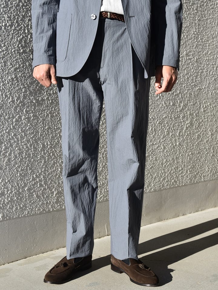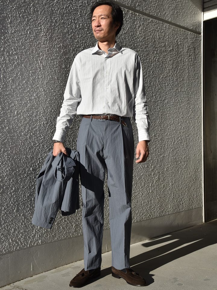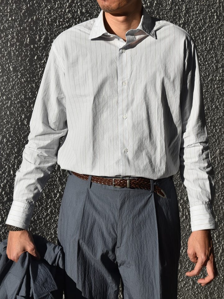 ◆ 着用アイテム:シャツ身長: 177cm / 普段サイズ:M / 着用サイズ:L 【サイズ感】スッキリとしている【素材感・着心地】張りのあるシャツ生地◆ 着用アイテム:スラックス 身長: 177cm / 普段サイズ:M / 着用サイズ:L 【サイズ感】ゆったりしている【素材感・着心地】張りのある生地