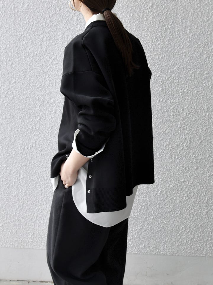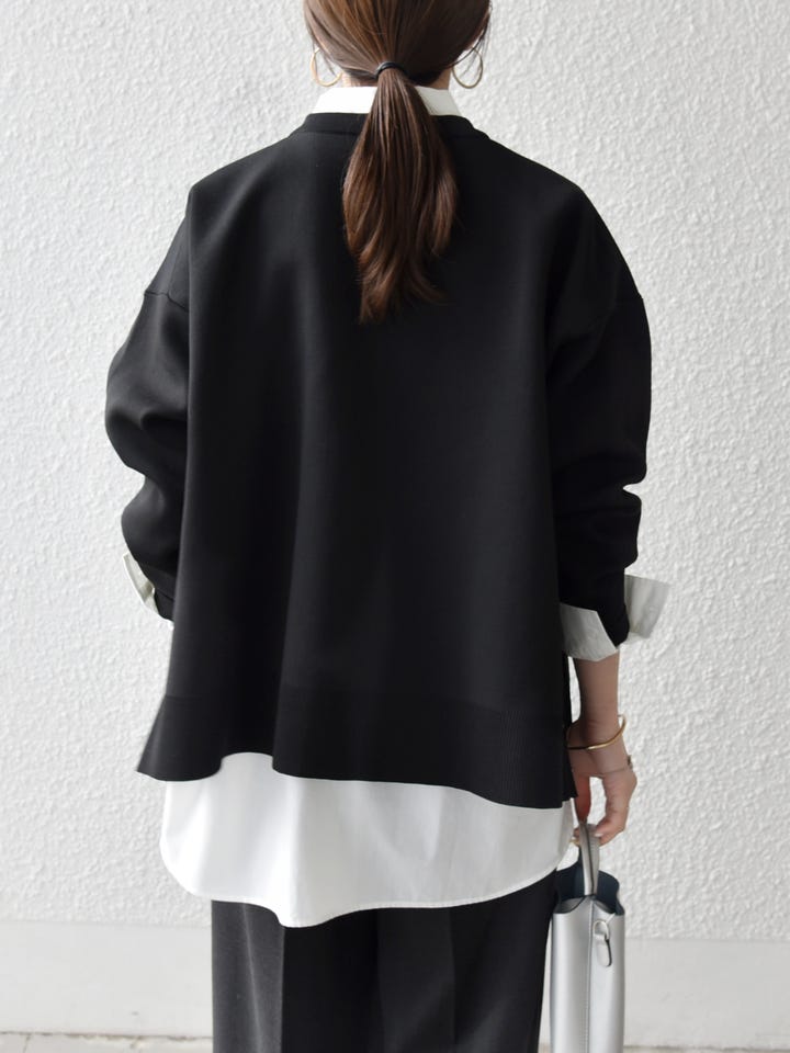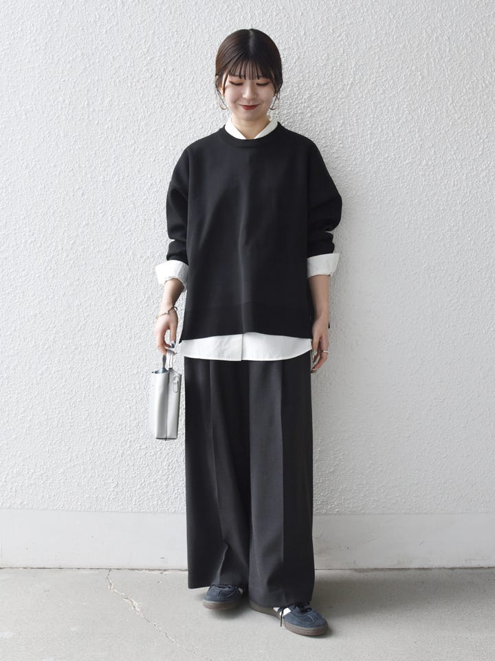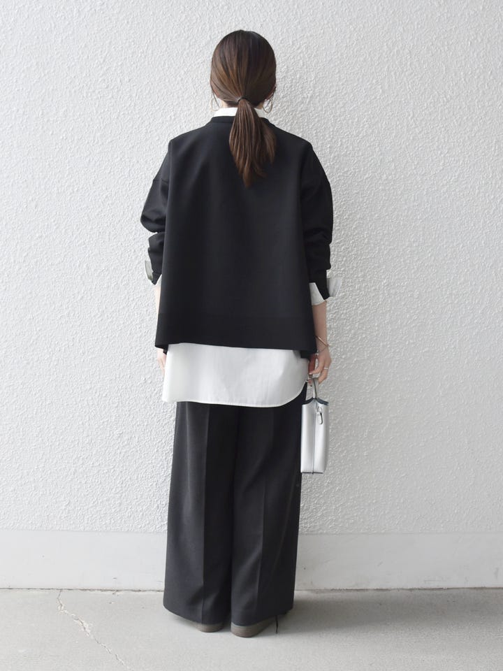 ブラック×ホワイトのレイヤードで、シンプルながらも奥行きのあるスタイリングに。