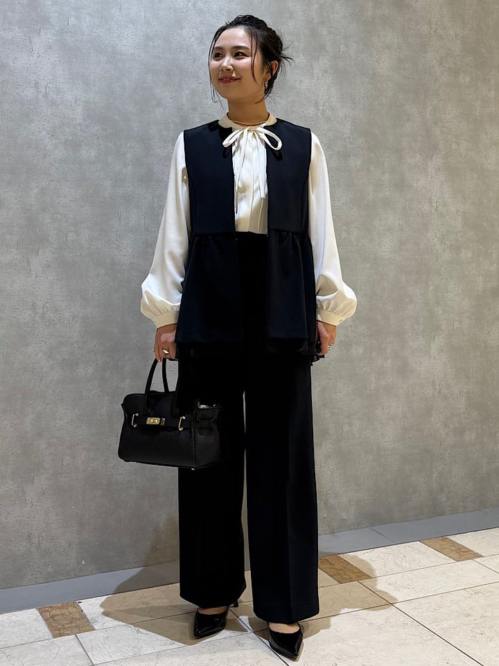 着用感 : 胸元は細いリボンのデザインで上品なイメージになります。白のブラウスが清潔感があり、お仕事用からセレモニーまで幅広いシーンで着用いただけるので、とても万能なブラウスです。