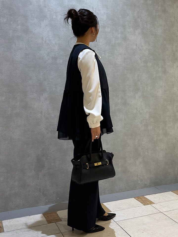 着用感 : シンプルなデザインながらお洒落見えする大人上品なジレです。マットな質感の素材に、裾にはオーガンジーの透け感のある素材を重ねてあり、ネイビーでも軽い印象になります。後丈の方が長めでヒップラインが隠れるのも嬉しいポイントです。