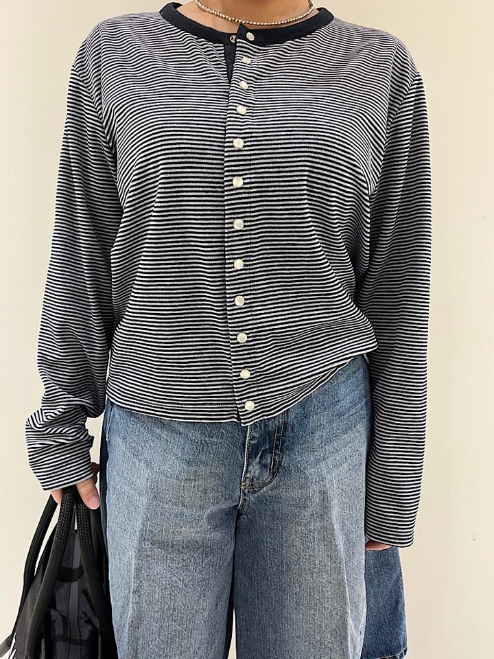 サイズ感:ちょうど良い。お袖少し長め。着丈はお尻かかるくらいで少し短め。