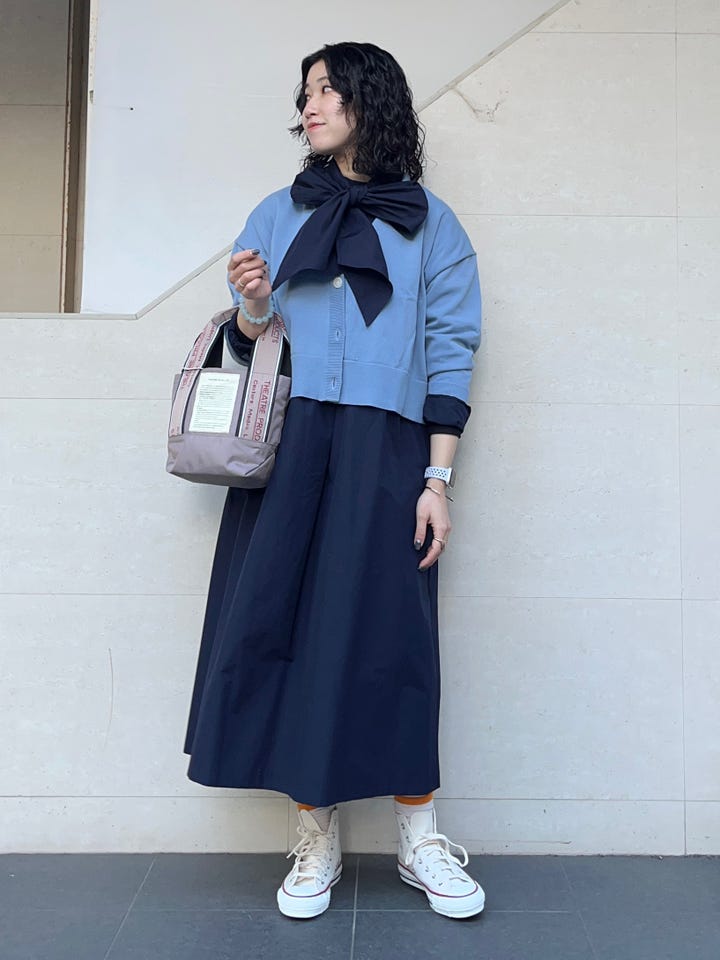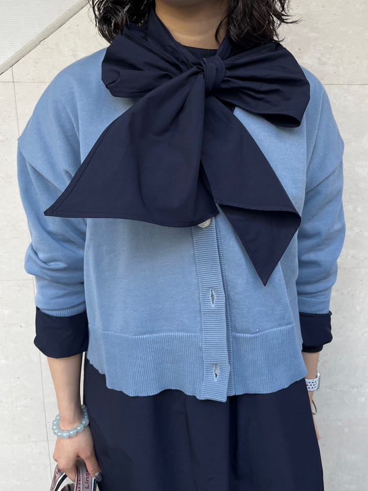 着丈はやや短めで、身体のラインを拾いにくい形です。ポリエステルが入っているので、少しシワになりにくいです。リボンは取り外しが可能で、腰に巻いたり、リボンせず垂らしてきたりアレンジができます◎