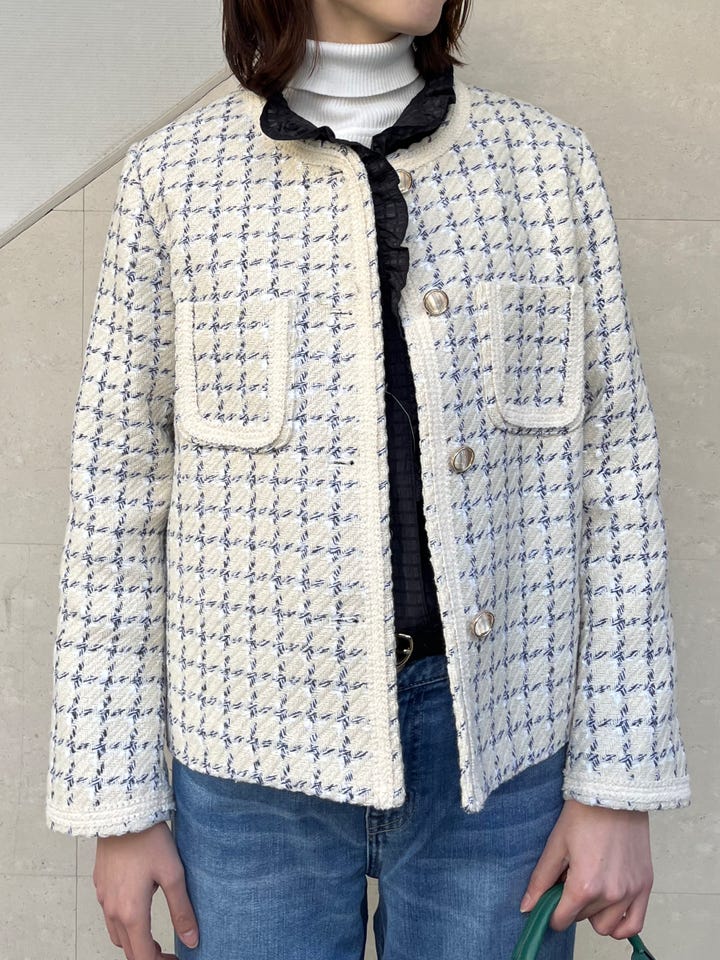 ◆ 商品名: ツイード パイピング ノーカラー ジャケット