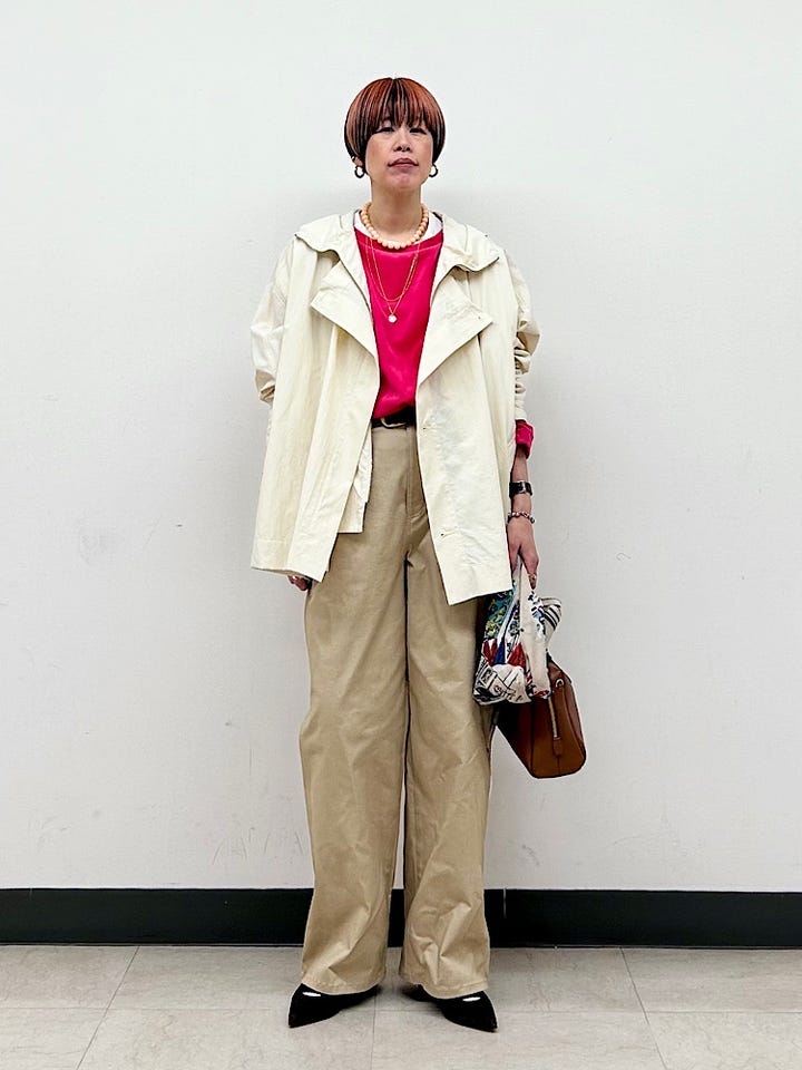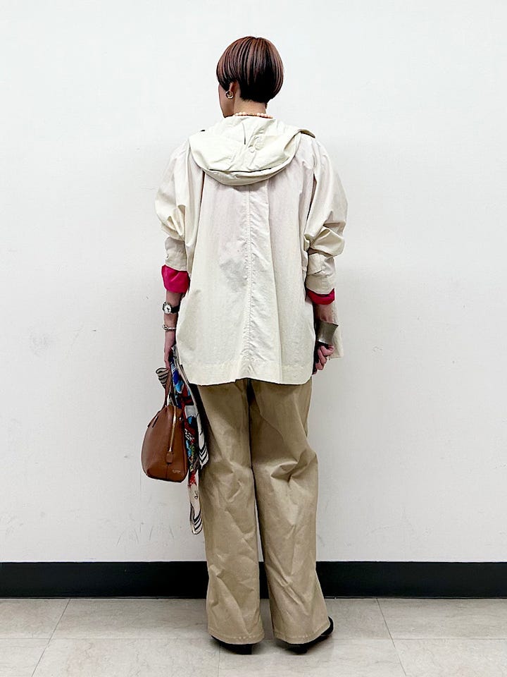 着心地:しなやかで軽いナイロンコート。裏地はありませんが、ゆとりがあるので滑りはよく着脱しやすかったです。ごわごわせず、ややマットな質感で、スポーティになりすぎません。