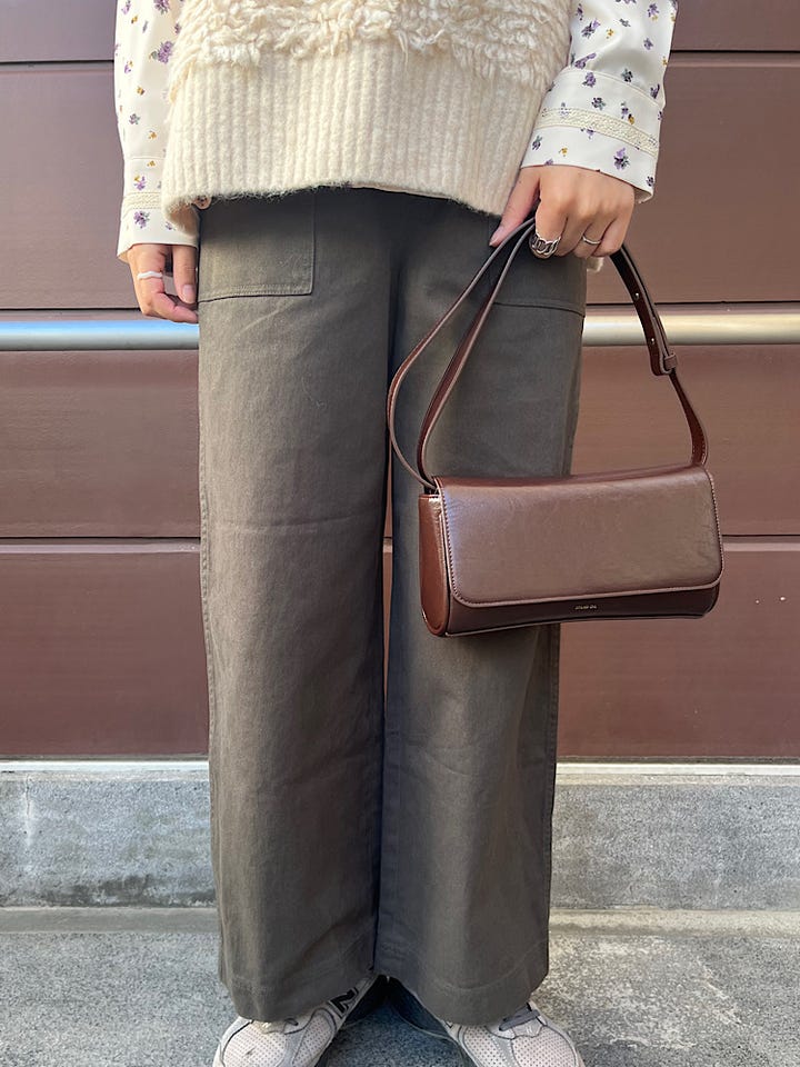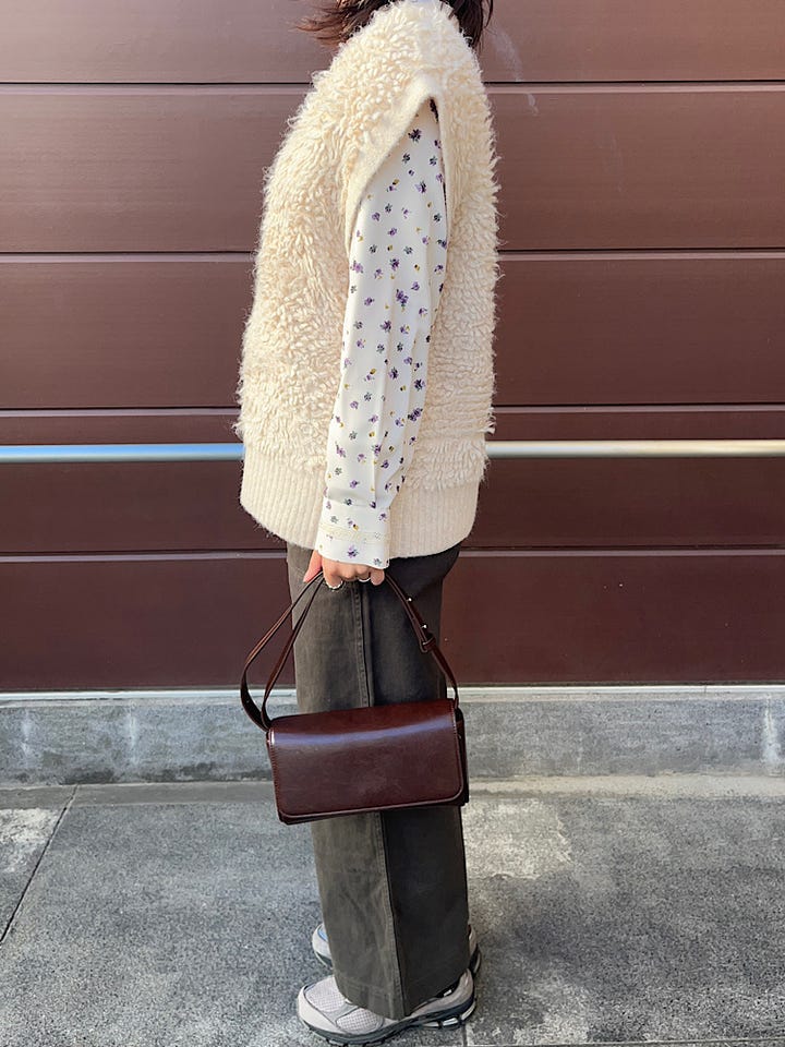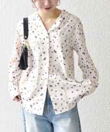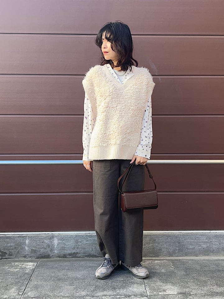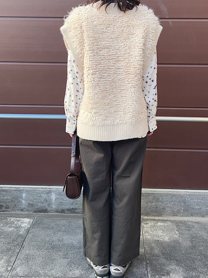 素材感・着心地:開襟シャツで首周りスッキリとして抜け感があります。寒い季節はハイネックと合わせても◎