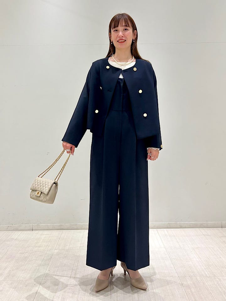 【素材感・着心地】同素材のジャケット合わせて着用可。肩紐は後ろで2段階で調節でき、後ろはゴムなのでストレスフリーの着心地です。スニーカーと合わせカジュアルに着こなすこともできます。