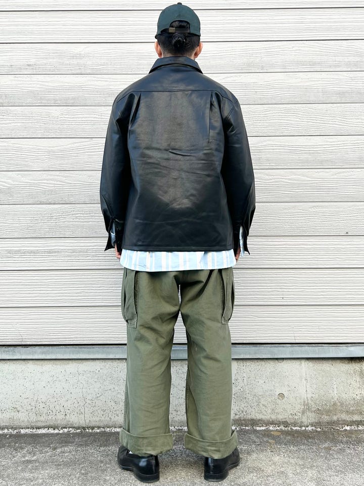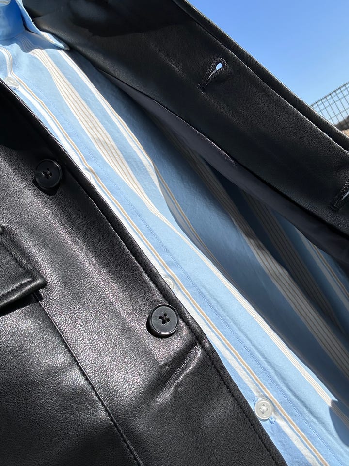 着心地:柔らかいフェイクレザーの生地で見た目より軽く、さっと羽織やすいです。