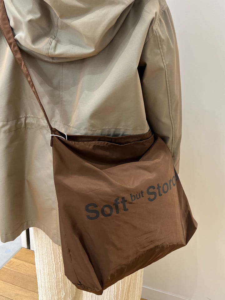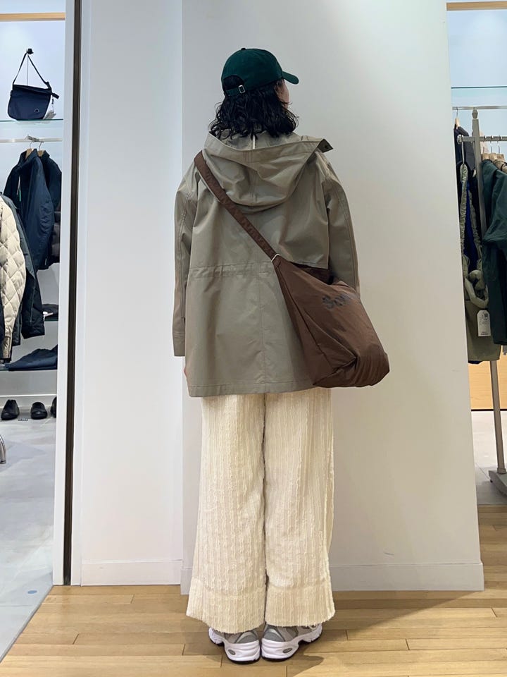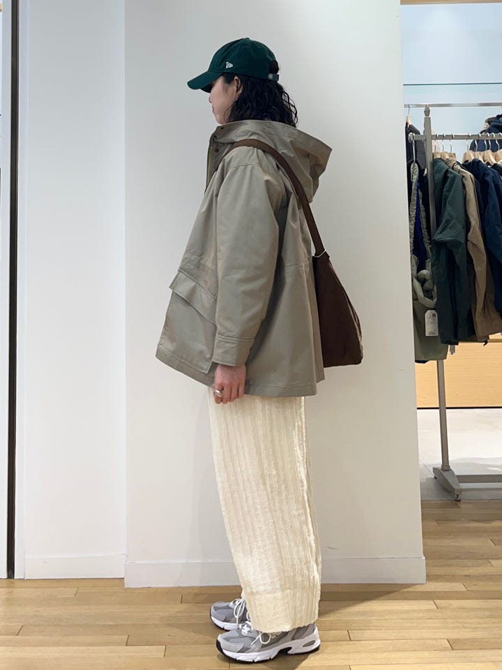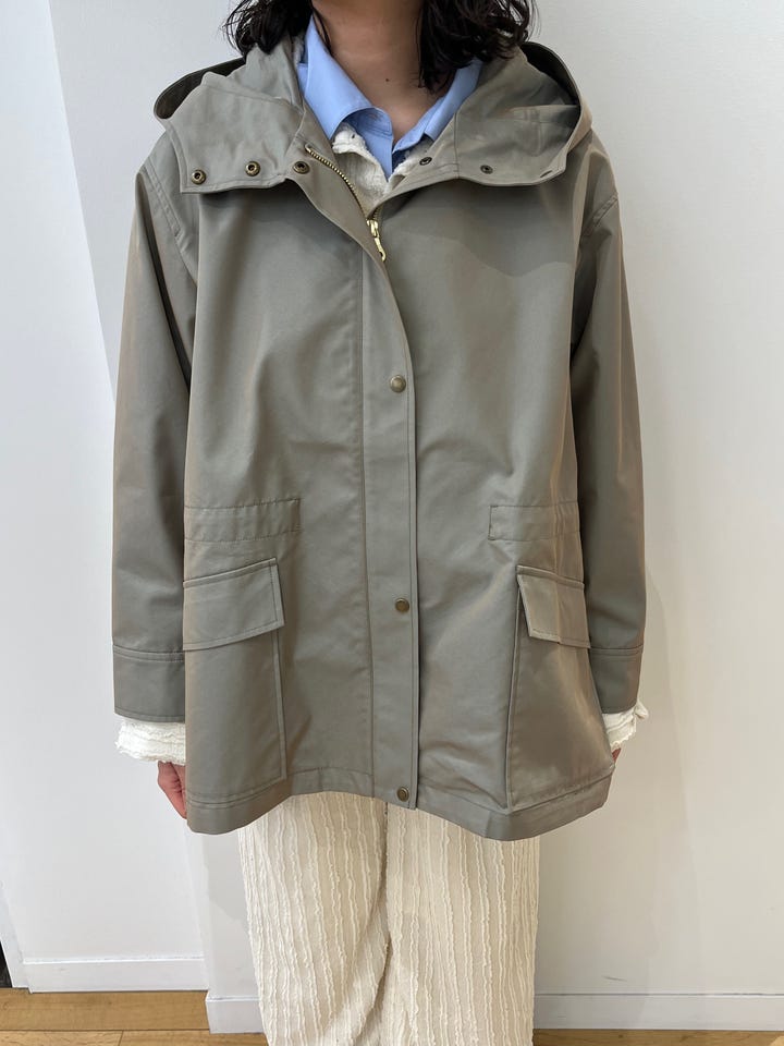 割とゆったりしたサイズ感で、ミディアム丈です。アームホールも広めなので中にニットなど、厚みがあるものも着ていただけます。ウエストにドローコードがついているので、Iラインのスカートやストレート、細めのパンツで合わせる時は絞るとバランスが取りやすいです◎