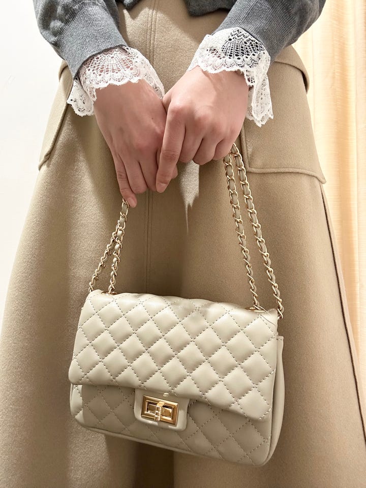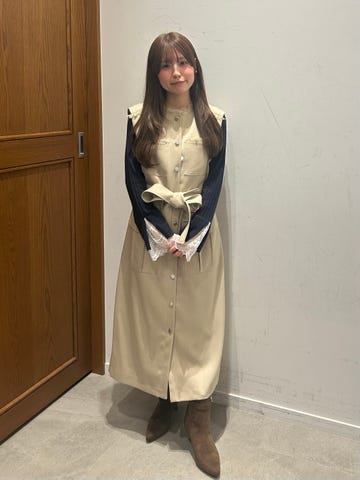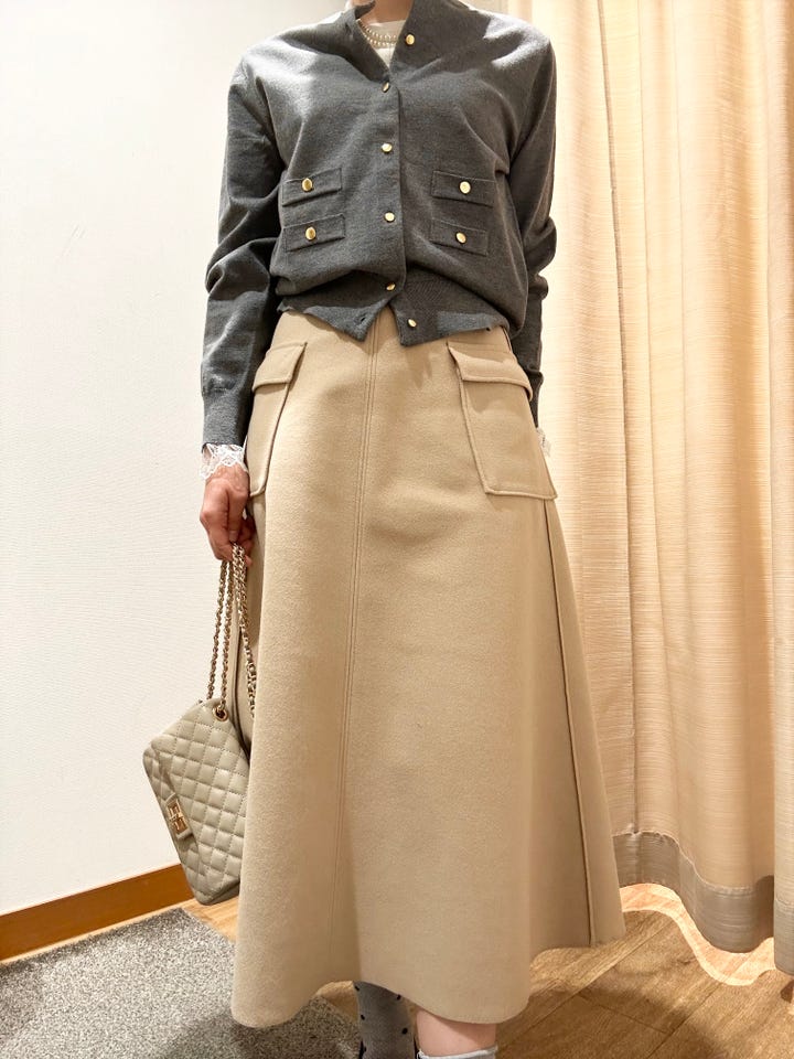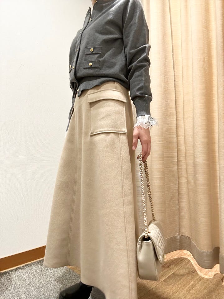 着心地:コートのような素材感で暖かいです。生地が硬めなので台形の形がしっかり出てくれます!