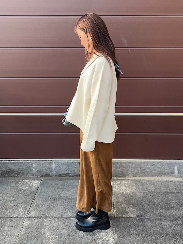 素材感・着心地: 広がりすぎず、体のラインを拾いにくいスカートです。カジュアルにもキレイめにもスタイリングしやすいスカートです。