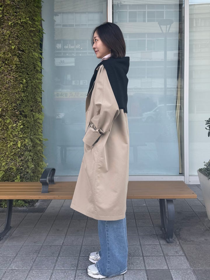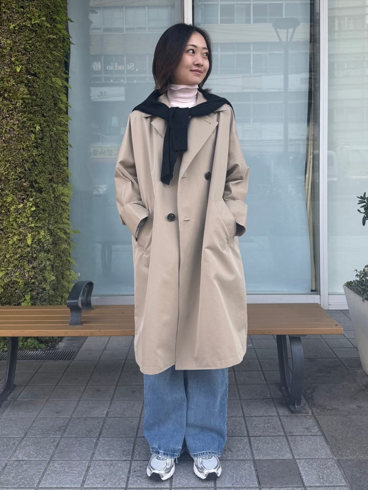 サイズ感・着心地:ゆとりあり。今回は中に着てるものが薄手ですが、冬に着るようなニットやセーター、スウェット合わせでもごわつかず綺麗に着ていただけるサイズ感です。凄く軽いので着ない時に腕にかけて持っているのも負担少ないと思います!カジュアルにも綺麗めにも合わせていただける素材感です。