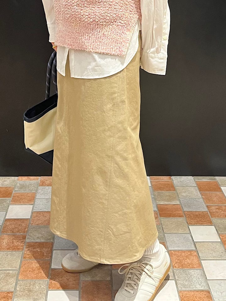 Aラインでストレッチが効いていて、スリットも入っているので見た目よりも快適な着心地です!硫化染めで色落ちも気にならないです◎シンプルで、通年着回せそうなスカートです!