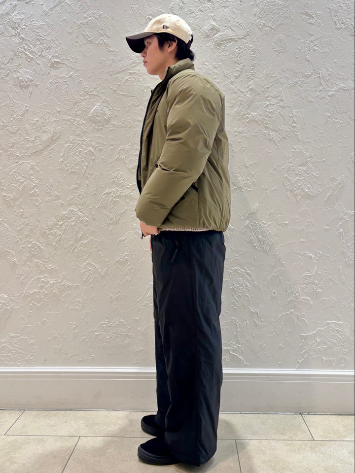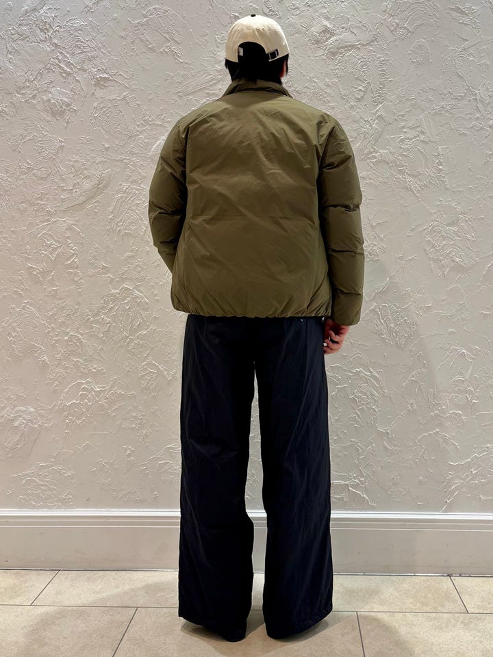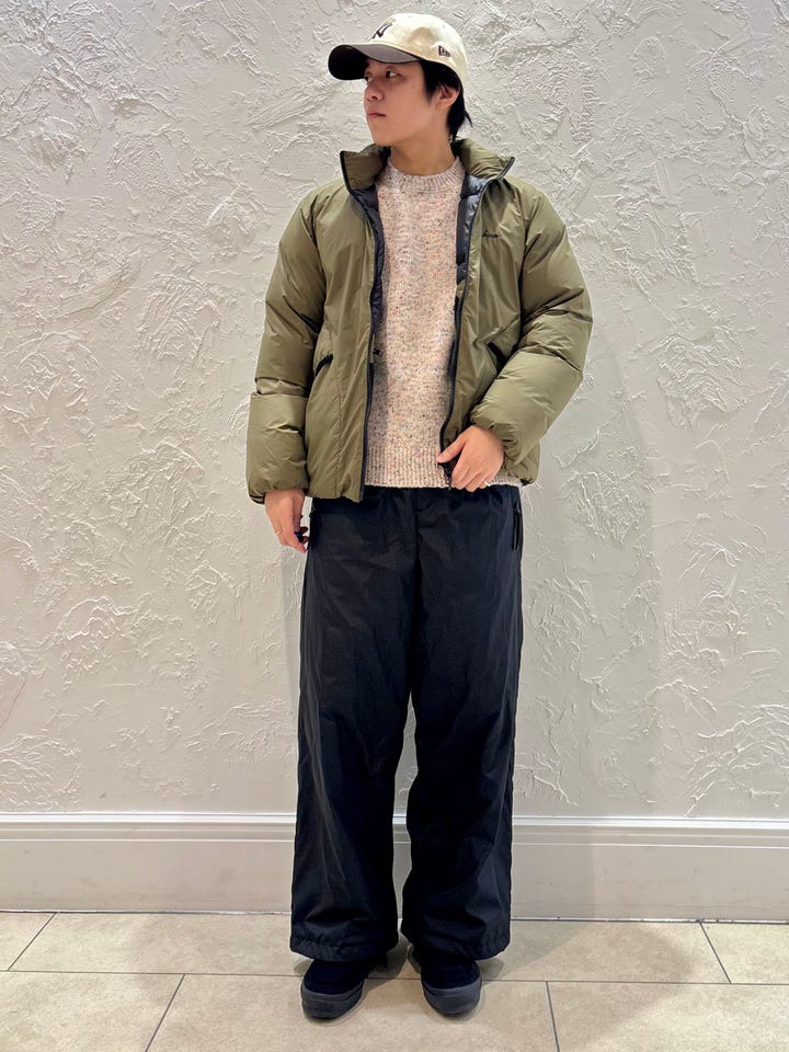 特徴:ダウンのパンツ。とにかく温かく太めのシルエットのパンツです。今回のような短丈と合わせてテック系の雰囲気にするのがおすすめです。
