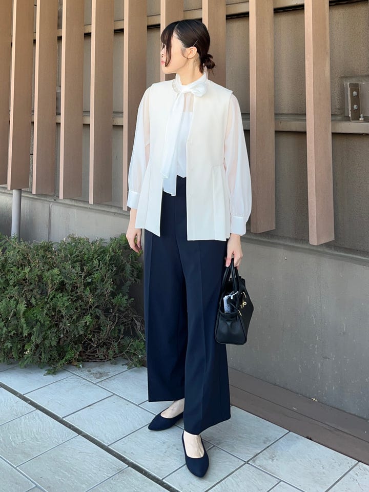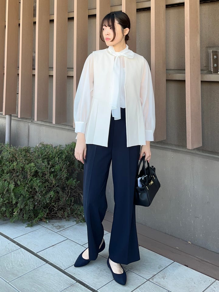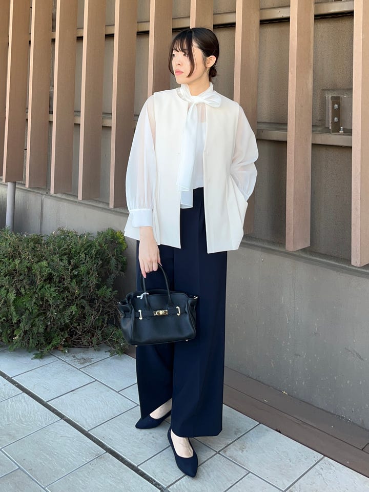 着心地:シアー素材のブラウス。リボンの巻き方次第で、様々なアレンジが可能です。今回は、片方のリボンにしております。