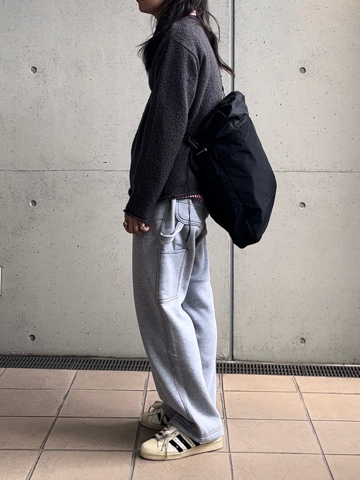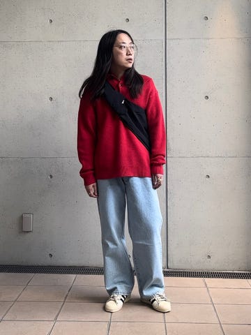 ちょっとしたお出掛けやお買い物など重宝し易いコーデ提案です。ニットはウール見えするポリエステル素材を使用。肌触りも良く、丸洗い出来ます。バッグは沢山入るので、幅広いく活躍してくれます。参考にいかがでしょうか。