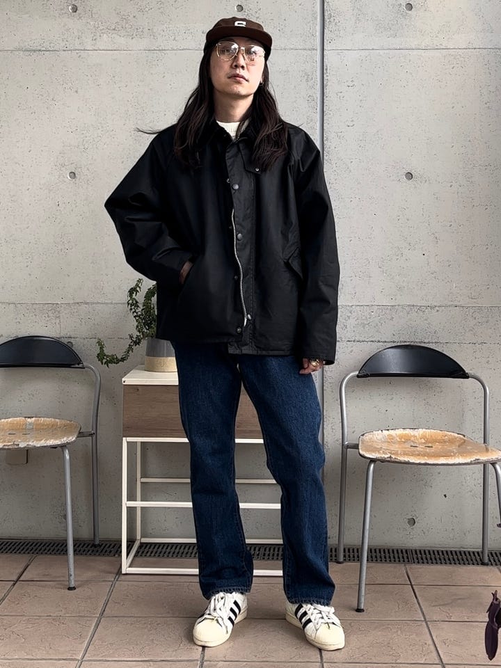 お出掛けやお買い物、デートなど幅広いお使いできるコーディネート提案です。ジャケットはどの世代の方にも合わせやすく、シャツやパーカーなど合わせやすいトランスポートジャケット。程良くオイル加工をしているので、バブアー初心者の方にも凄くおすすめです。参考にいかがでしょうか。