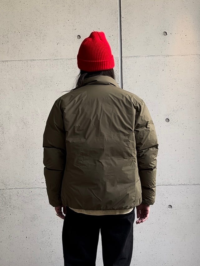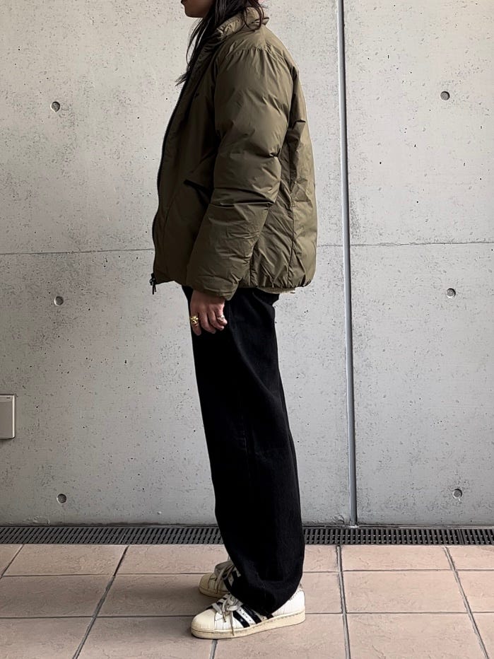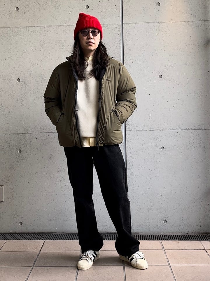 レジャーやお出掛けの時におすすめのコーディネート提案です。ジャケットは中綿ダウンを使用、軽くて暖かくどのシーンにもお使いできます。冬には一軍間違い無しのジャケットです。差し色に赤のニット帽にしてみました。参考にいかがでしょうか。
