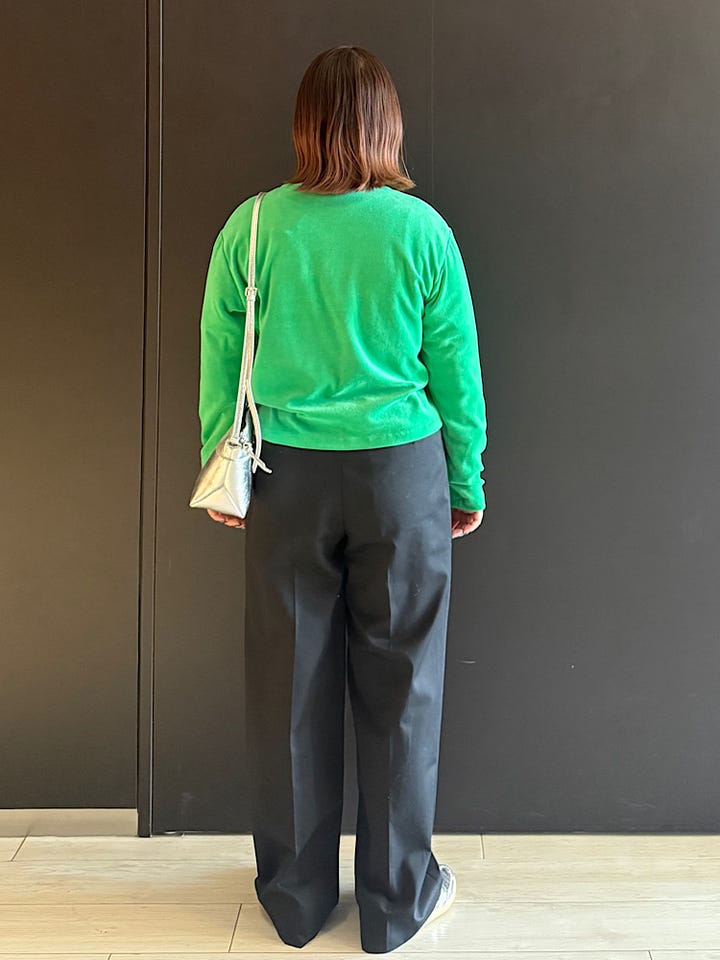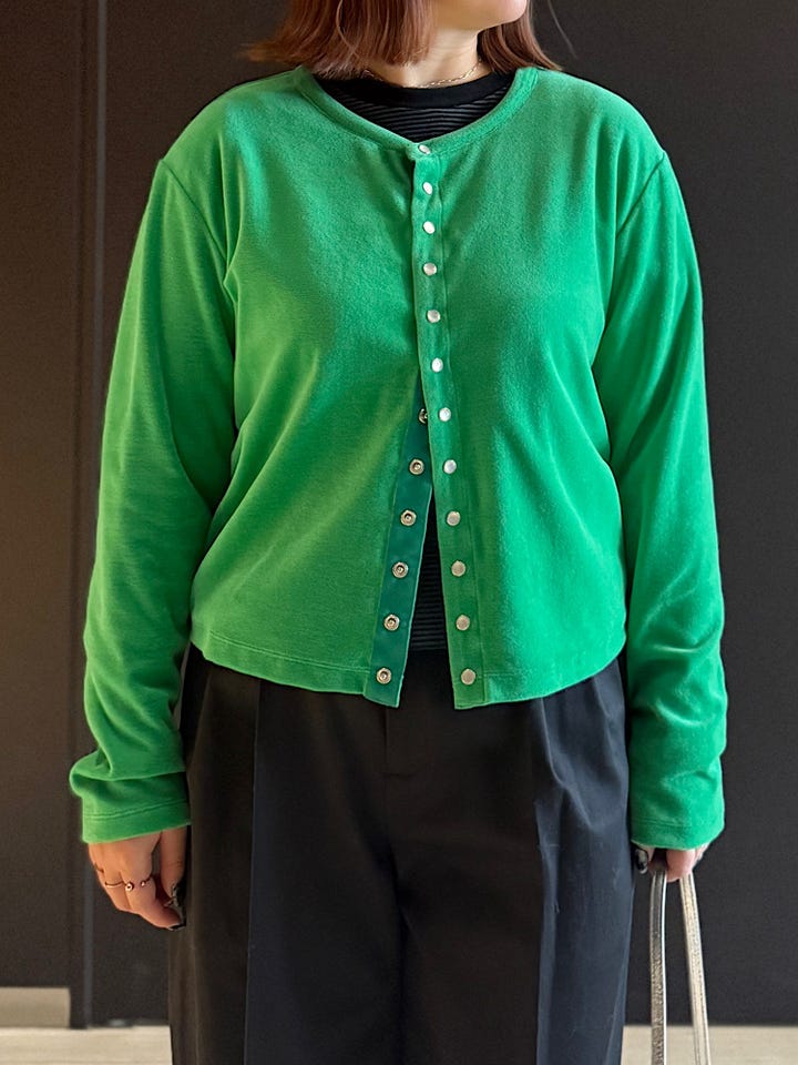【着心地】ベロア素材のカーディガンで丈感は短めでパンツスタイルからスカート合わせなど幅広く使って頂けると思います。