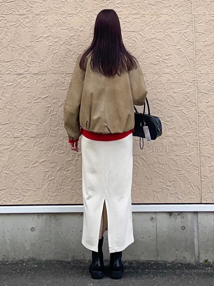肉厚な素材で、丈は長め。生地はストレッチが効いており、裏地も付いているので楽に着用できる。
