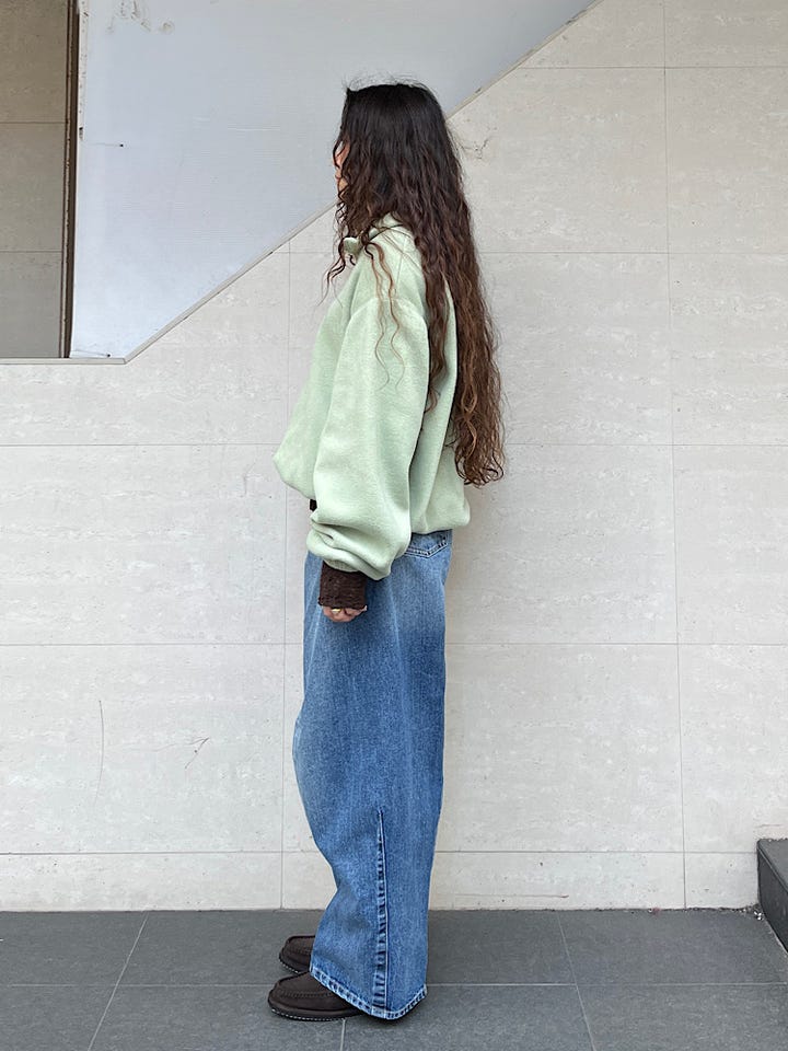 着心地:ゆったりとしたサイズ感ですが、着丈がコンパクトなのですっきりとしたシルエットになります。