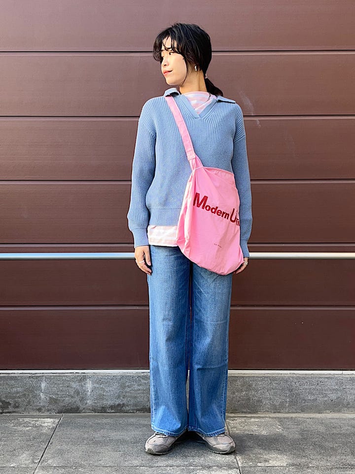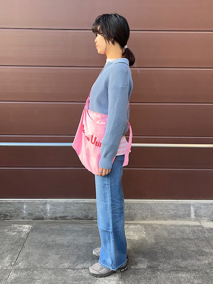 素材感・着心地:スッキリとした着丈のためレイヤードスタイルもしやすいです。