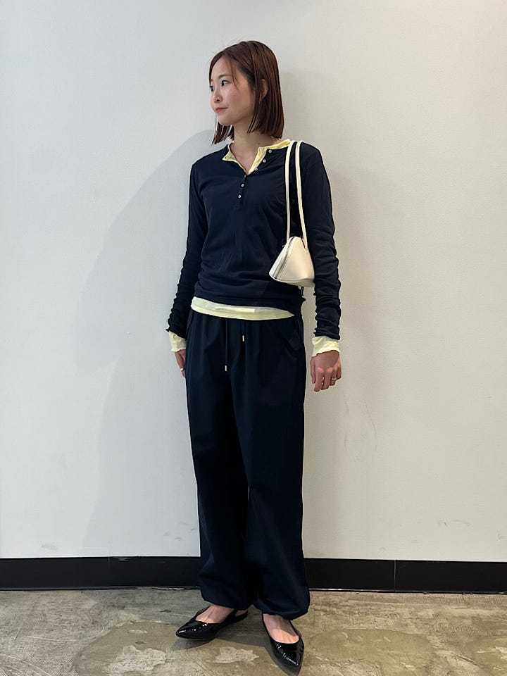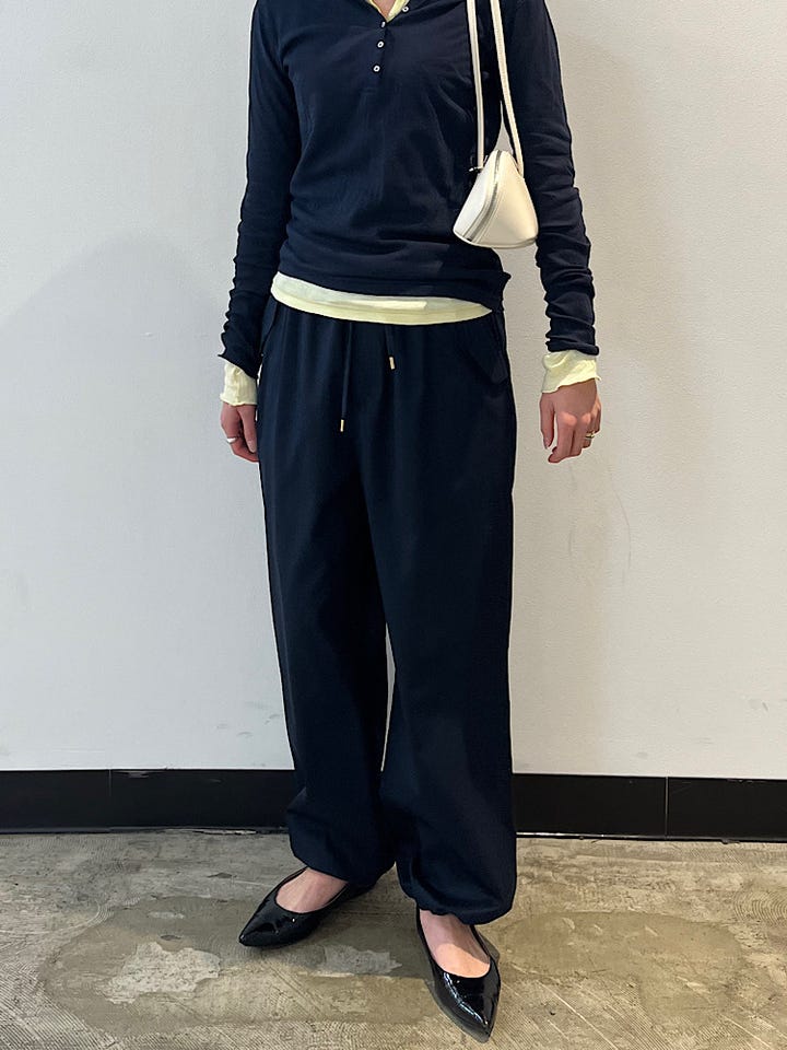 サイズ感: ゆるっと履きたかった為腰履きで着用しています。ウエストがゴムなので身長やスタイリングによって腰の位置を変えて着用できます。裾の絞りでも調整可!