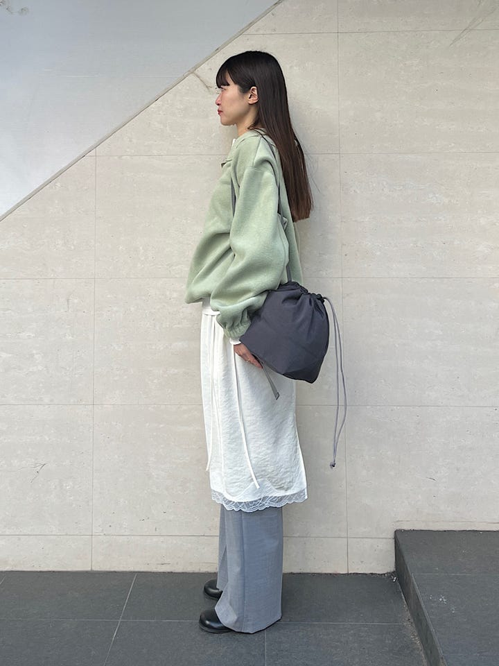 ウールとポリエステルのサラッとした素材で柔らかく、季節も長く着用しやすいです。程よいボリュームで合わせやすくON/OFF兼用にもおすすめです。