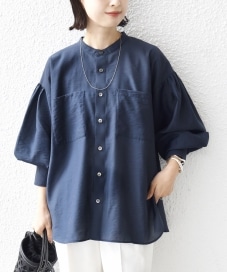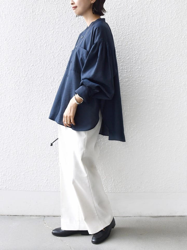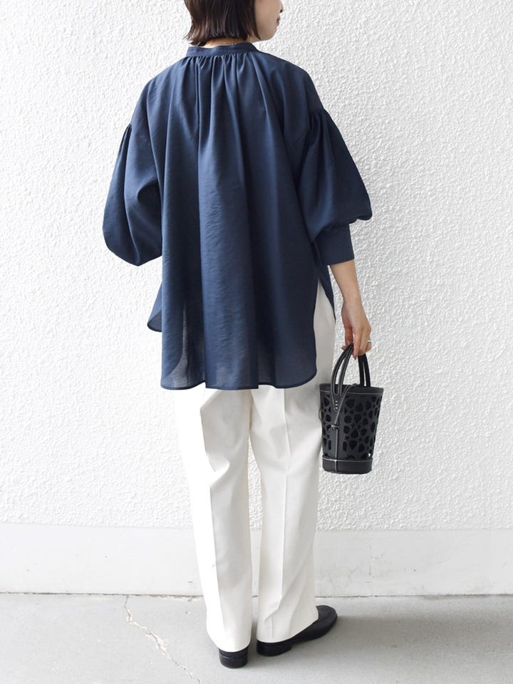 着心地:袖や背中にたっぷり入ったギャザーが動くたびに揺れて、一枚でサマになります。肌離れが良いさらっとした質感でストレスフリーな着心地です。