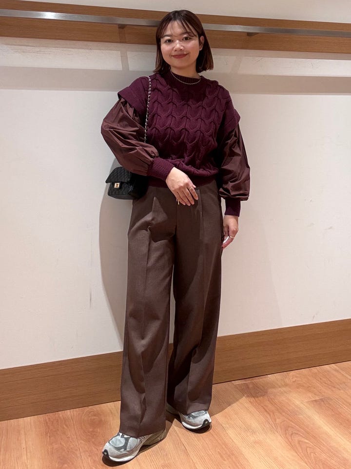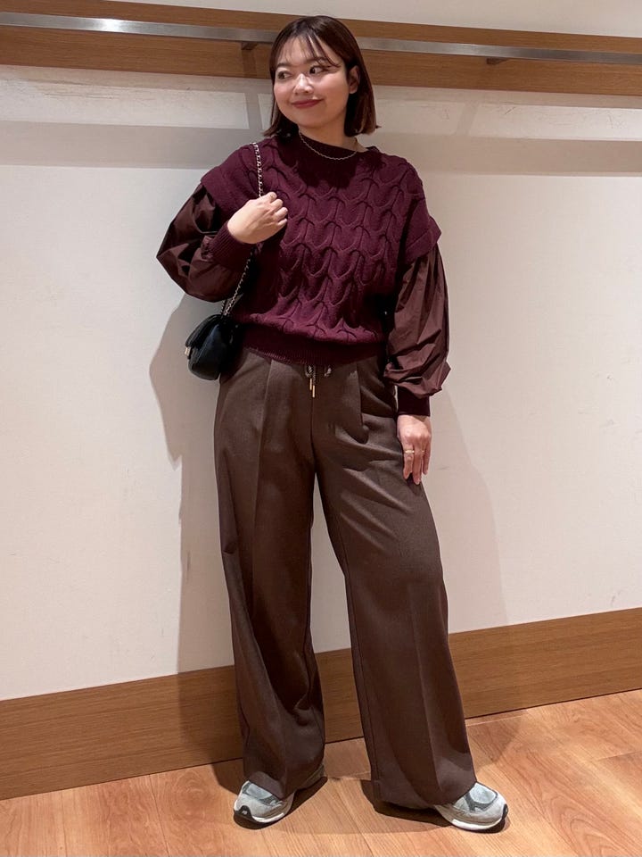 足のラインを綺麗に見せてくれるウールライクのワイドパンツ。インしてベルトループをしっかり見せても可愛いです♪