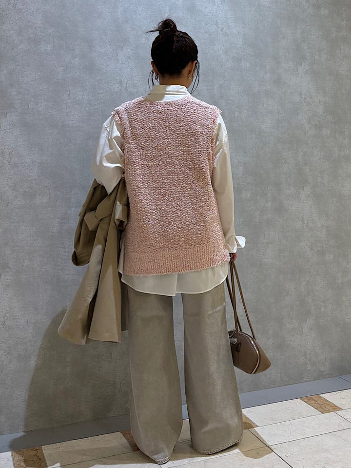 着用感 : 春らしい明るいピンクが可愛いベストです。ニットツイード素材なので、柔らかい生地感で楽な着心地です。Vネックなのでお顔がスッキリみえます!