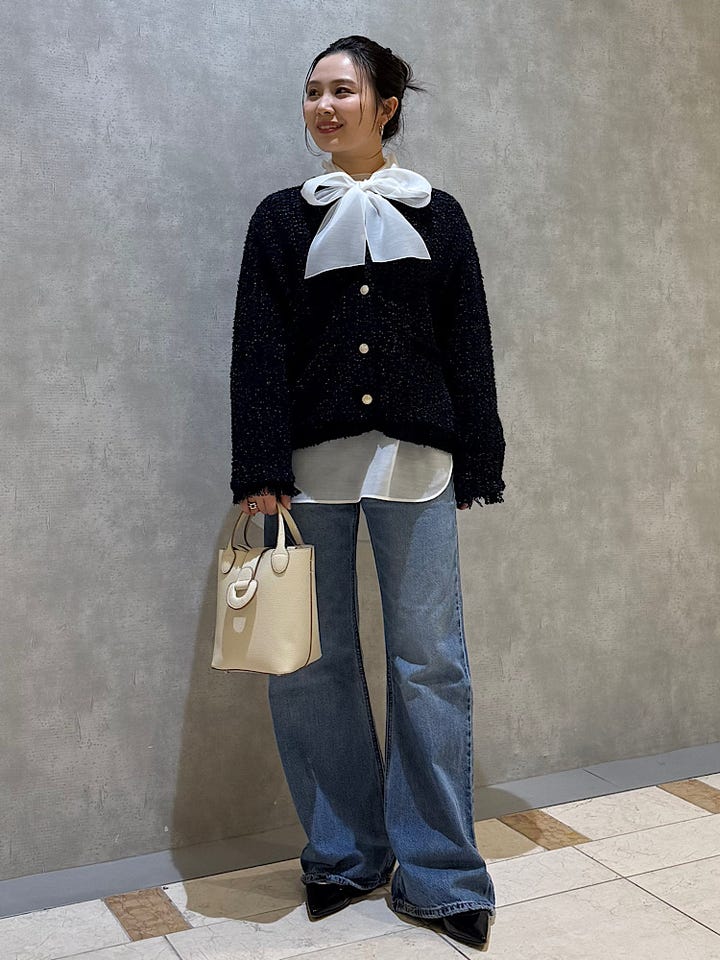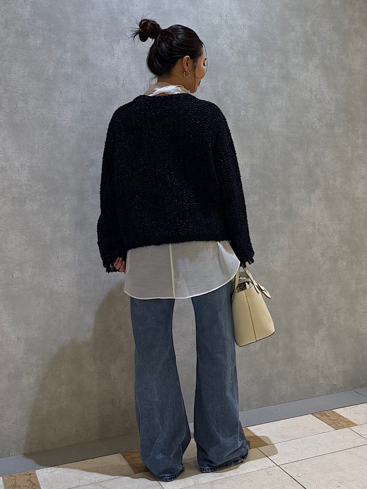 着用感 : 春の軽羽織りにもぴったりな、ニットツイード素材のカーディガンです。合わせるボトムやインナーによってカジュアルからフォーマルなシーンまで幅広くご着用いただけます。ロゴteeなどと合わせるのもおすすめです!柔らかくて軽い素材なので楽な着心地です。