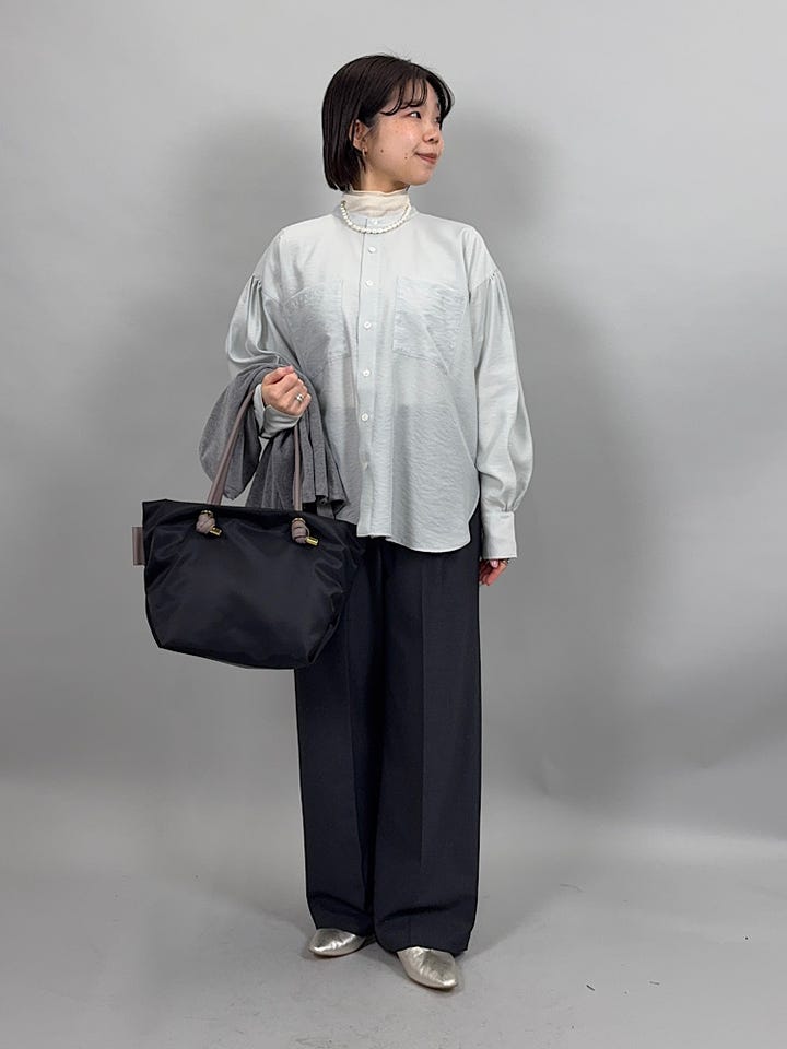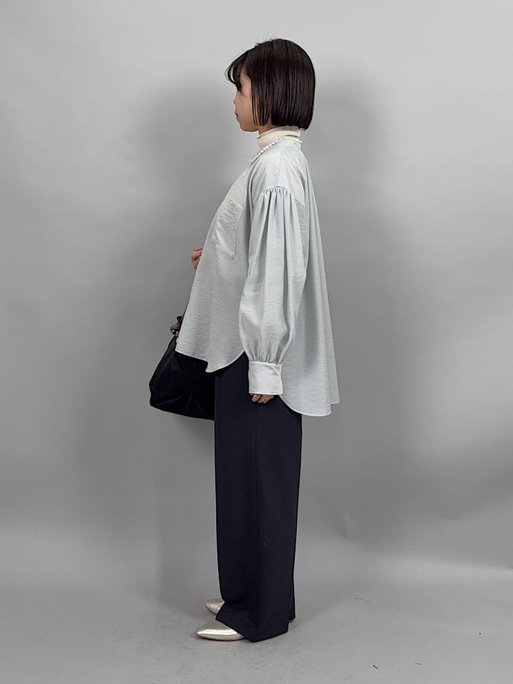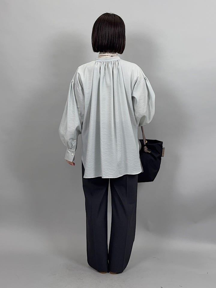 さらっとした素材感。程よい光沢があります。軽い着心地です◎ボリューム袖や後ろ見頃のたっぷり入ったギャザーで華やかに着ていただけます。
