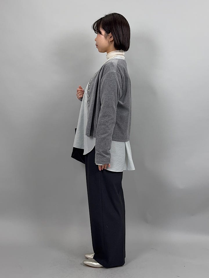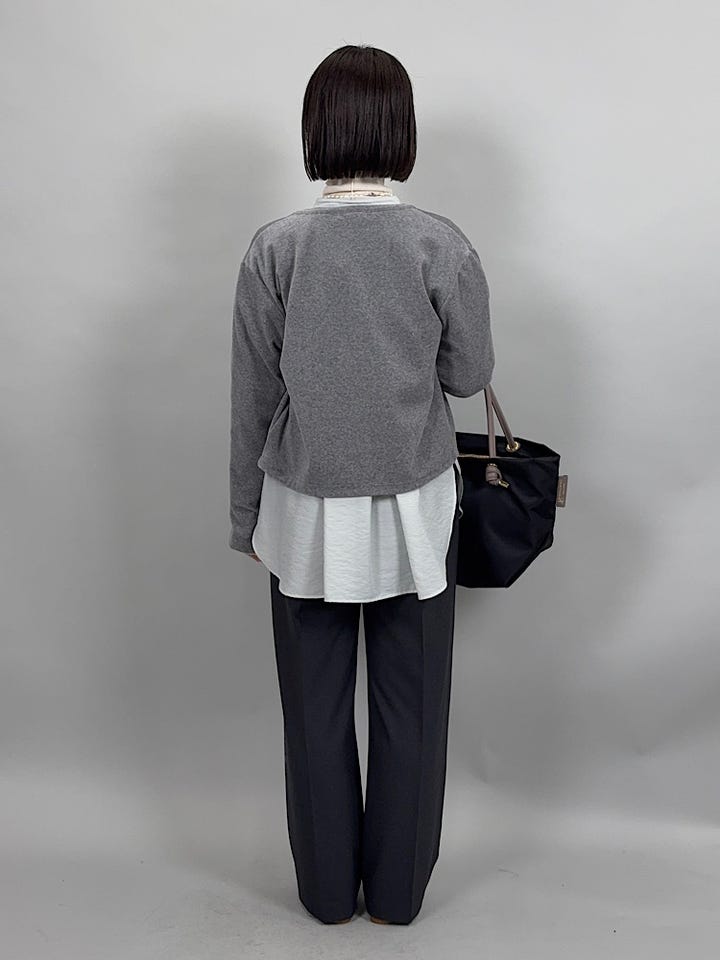 ふわっと膨らみのある素材感。肉感があり1枚でもあたたかく着ていただけます◎短丈で袖幅のある形がスタイルアップして見えます。ボリューム袖のブラウスに羽織りましたが、すっきり着ることができました。