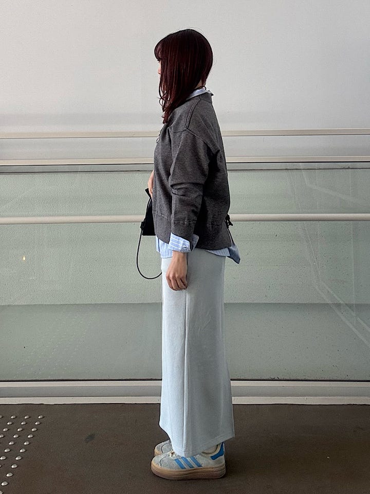 素材感/着心地:ストレッチが効いていて動きやすいです。丈感やや長めです。きれいめにもカジュアルにも使いやすいアイテムです。