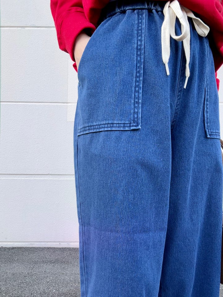 ウエストが全体とゴムで普段のデニムに比べて非常に柔らかい生地感ですので着心地がとてもよいです♪