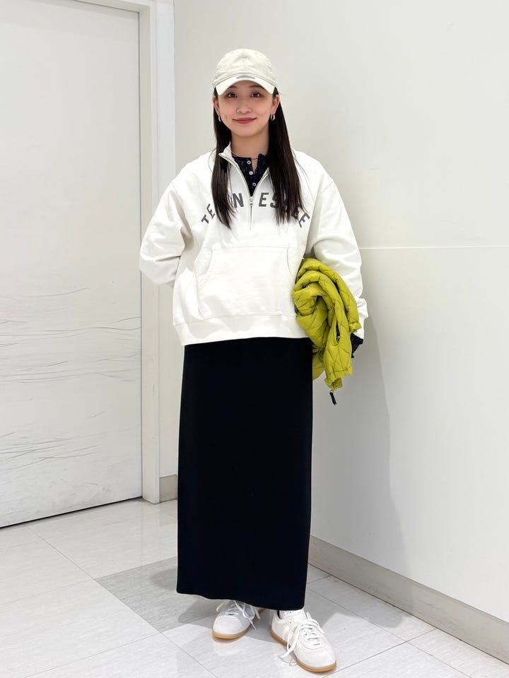 ゆったりですが、丈が長すぎないため、低身長の方も着やすいサイズ感になっています。襟なしのハーフジップタイプで、インナーにシャツやタートルネックも合わせやすいアイテムです♪