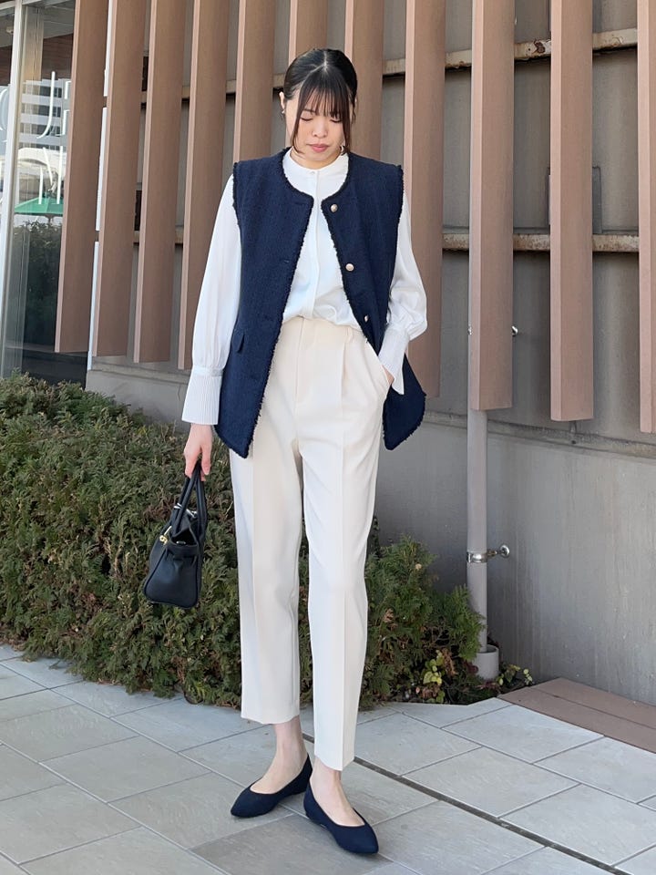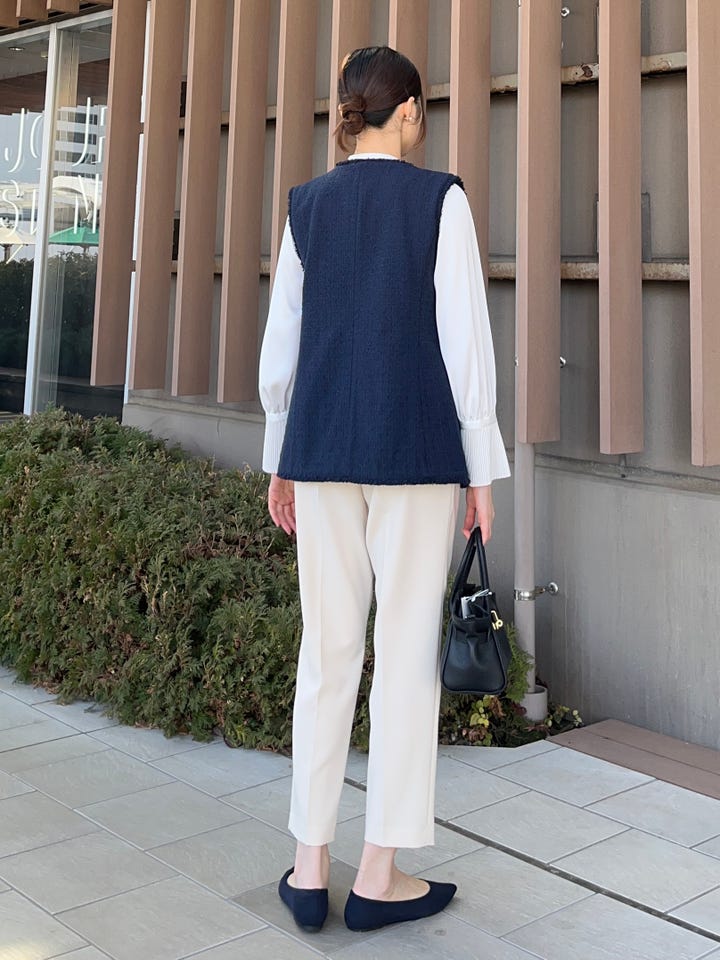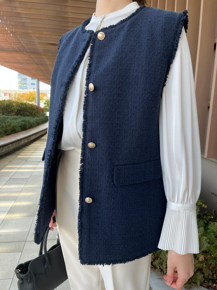 着心地:ラメ糸を使用したツイードジレ。丈長め。