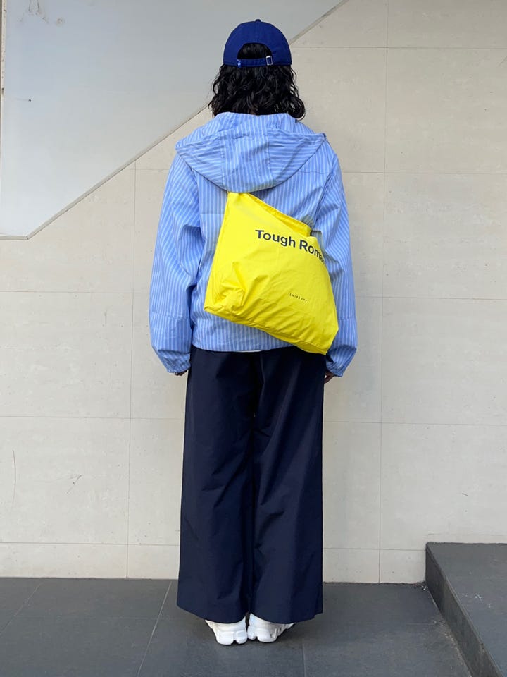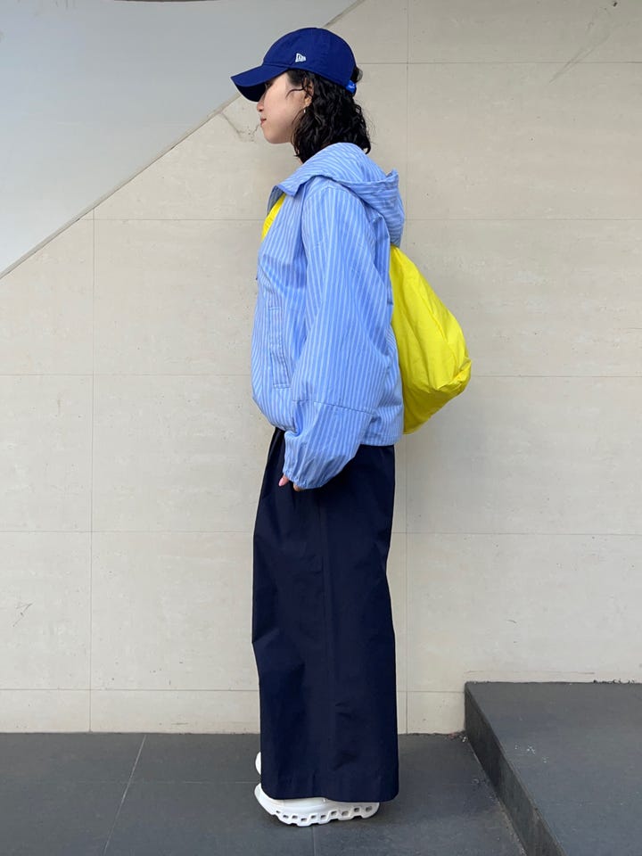 シャツのように薄手で、綿だけでなくナイロンも入っている、少しシャカッとした生地です。裾にドローコードが付いていて、シルエットを変えられます。ゆったりしたサイズ感で、袖はやや長めでしたが、袖口がゴムなので邪魔にならないです◎