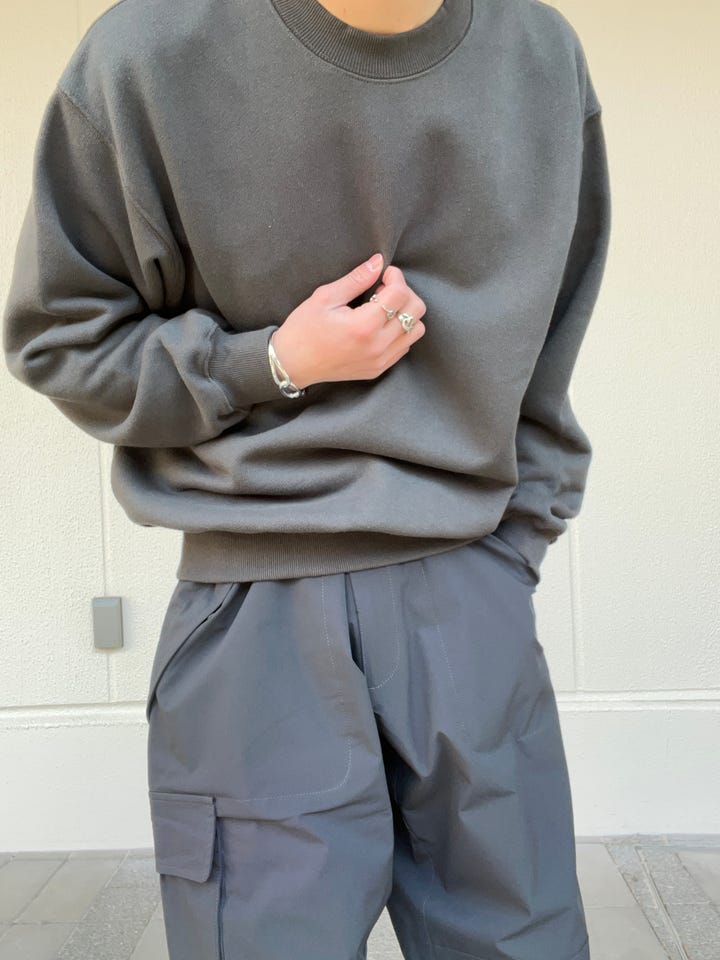 生地が凄くしっかりしているトレーナーで、リブもかかっているので、短丈でも着用していただけますし、普段のシルエットでも着用していただけます。