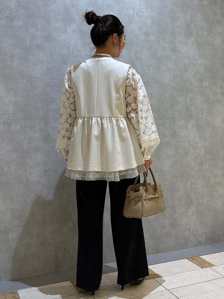着用感 : シンプルなデザインながらお洒落見えする大人上品なジレです。マットな質感の素材に、裾にはオーガンジーの透け感のある素材を重ねてあり、軽い印象になります。後丈の方が長めでヒップラインが隠れるのも嬉しいポイントです。
