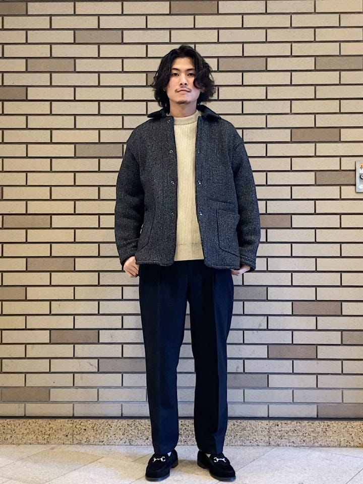 サイズ感:ややゆったり目、中に厚手のニット着用できるサイズ感です。