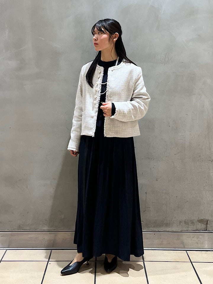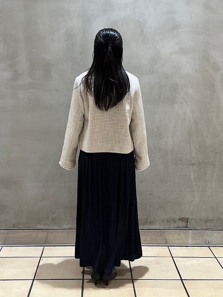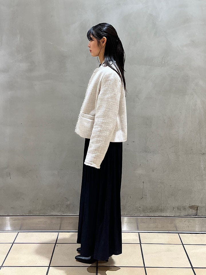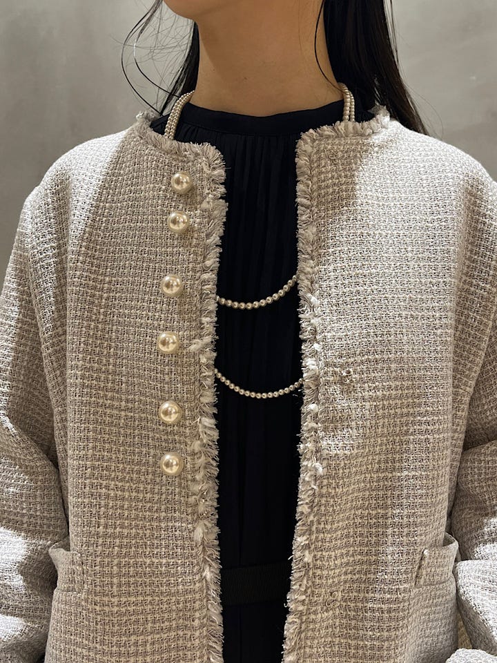 素材感・着心地:フリンジのついたツイード素材の為程よく華やかで、大粒パールボタンがポイントの着映えする1枚。