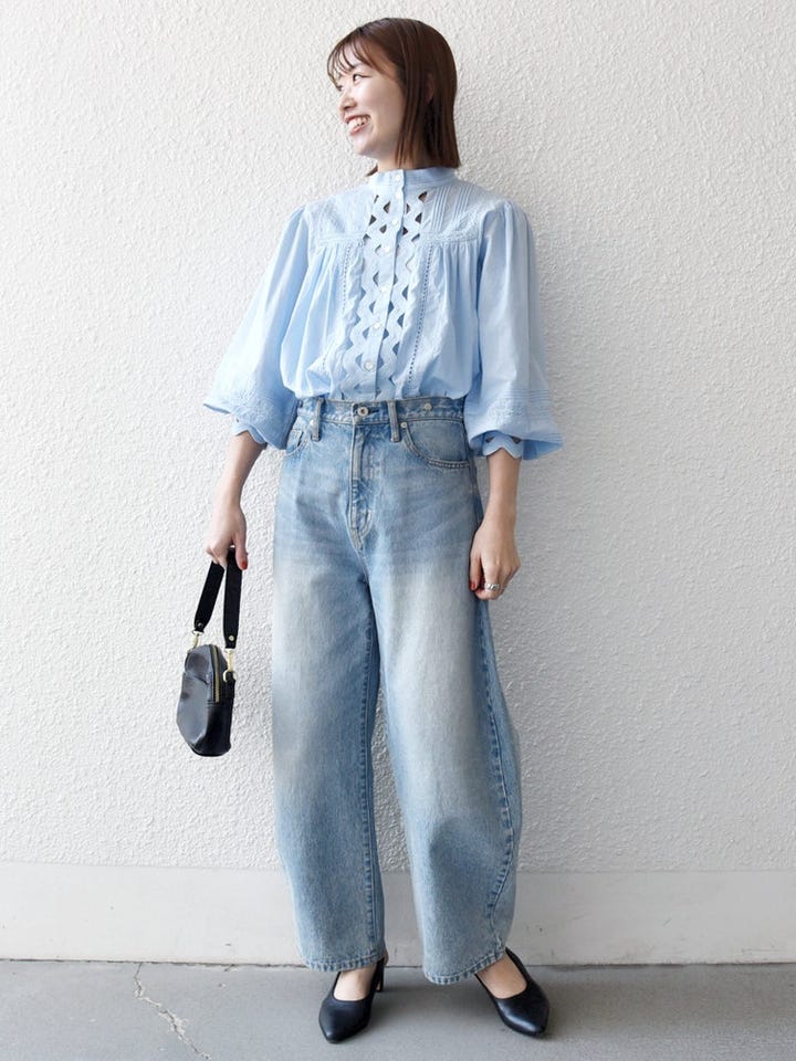 着用アイテム:キャンブリック スタンド カラー レース シャツ ブラウス ライトブルー