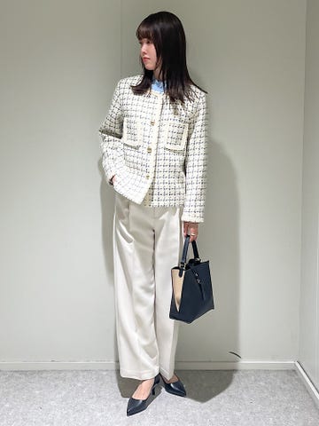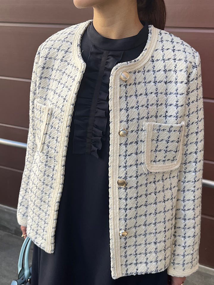 〔ONE SIZE〕SHIPS any: ツイード パイピング ノーカラー ジャケット
